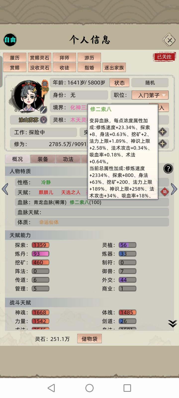 李青侯到手,血脉就收集完了,麒麟,巨魔,鲲鹏,3血脉收集完成。剩下的就是配体质了,不过也好配,毕竟全部名人都抓过来了。这个档很顺利,开局遇到朝夕问道花,直接老祖化神2了,100多年把全部名人都抓过来了。要不是升级升仙台没材料(拿仙道升仙令),耽误点时间,早配好了。算是最顺利的一个档。