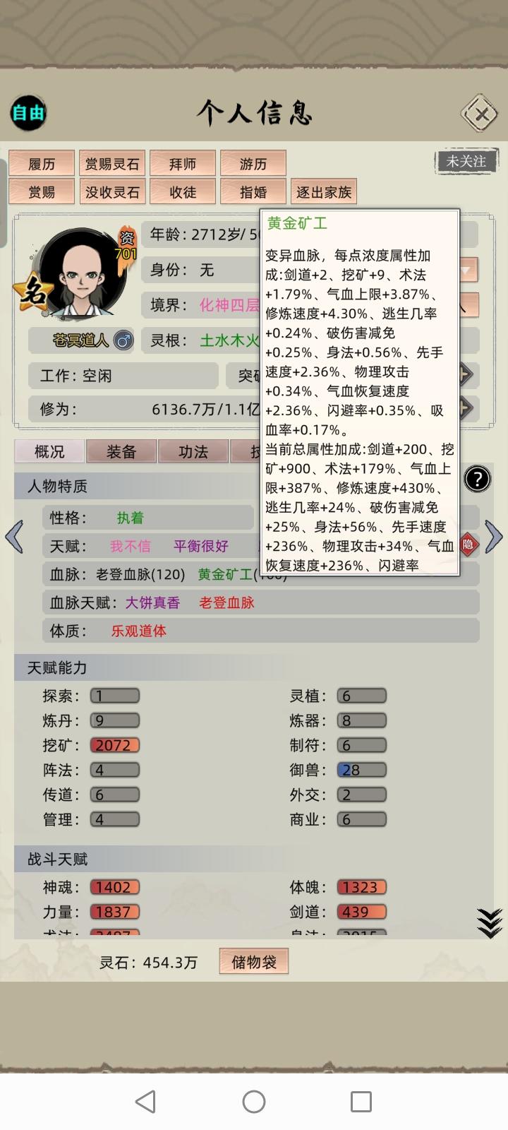 众所周知(之前论坛有人发过)变异血脉的属性效果取决于修士面板属性的占比。举个栗子:就是物攻高的修士觉醒血脉,更容易出高物攻天赋,先手高的同上。有人集齐三名人血脉加十多个红色体质、天赋,试图用一个六边形战士觉醒一个六边形天赋。但是人不能既要又要,什么都想要的后果就是,你会得到一个平平无奇的血脉,而这个血脉,还是你数十次回溯时间所能得到的最好结果。这对战斗修士或许影响不大,但对生活职业的修士,是
