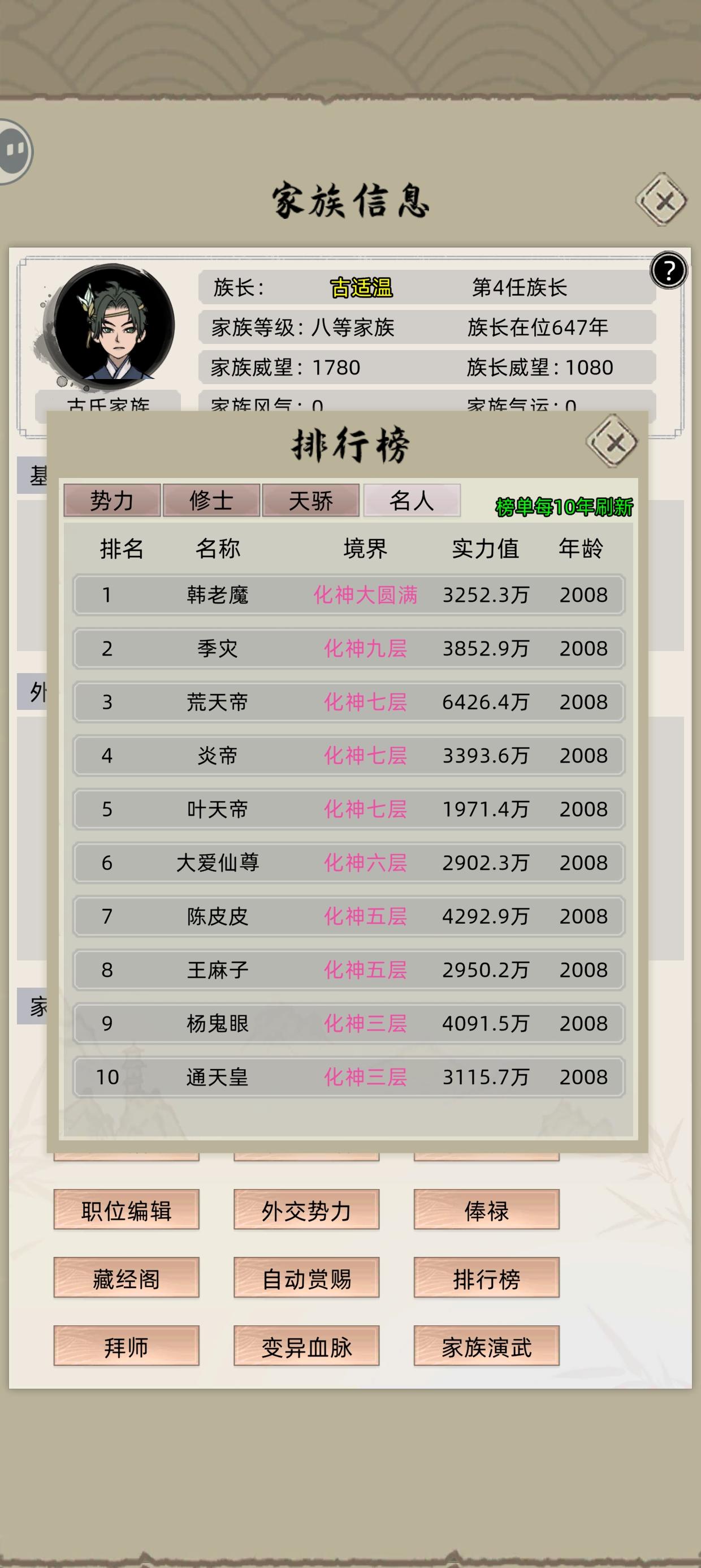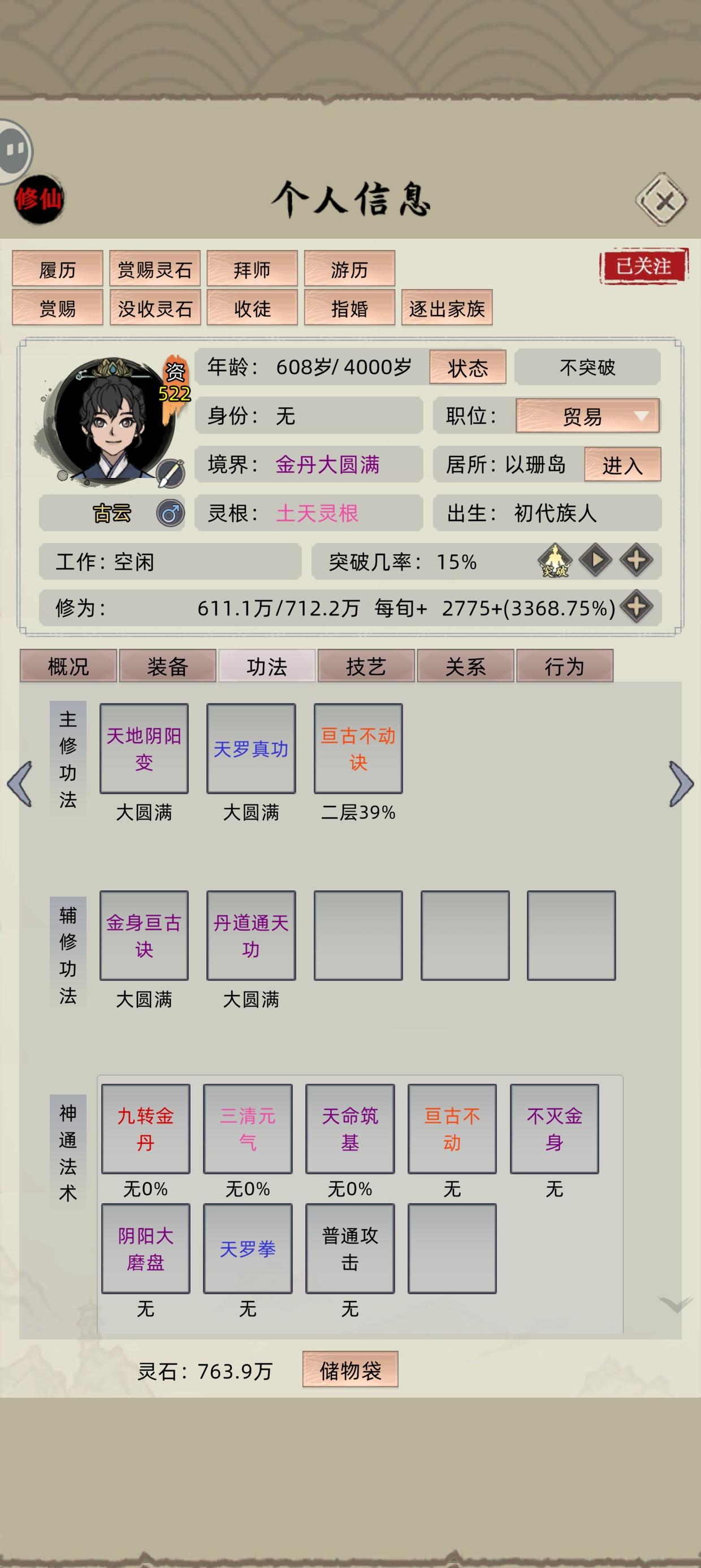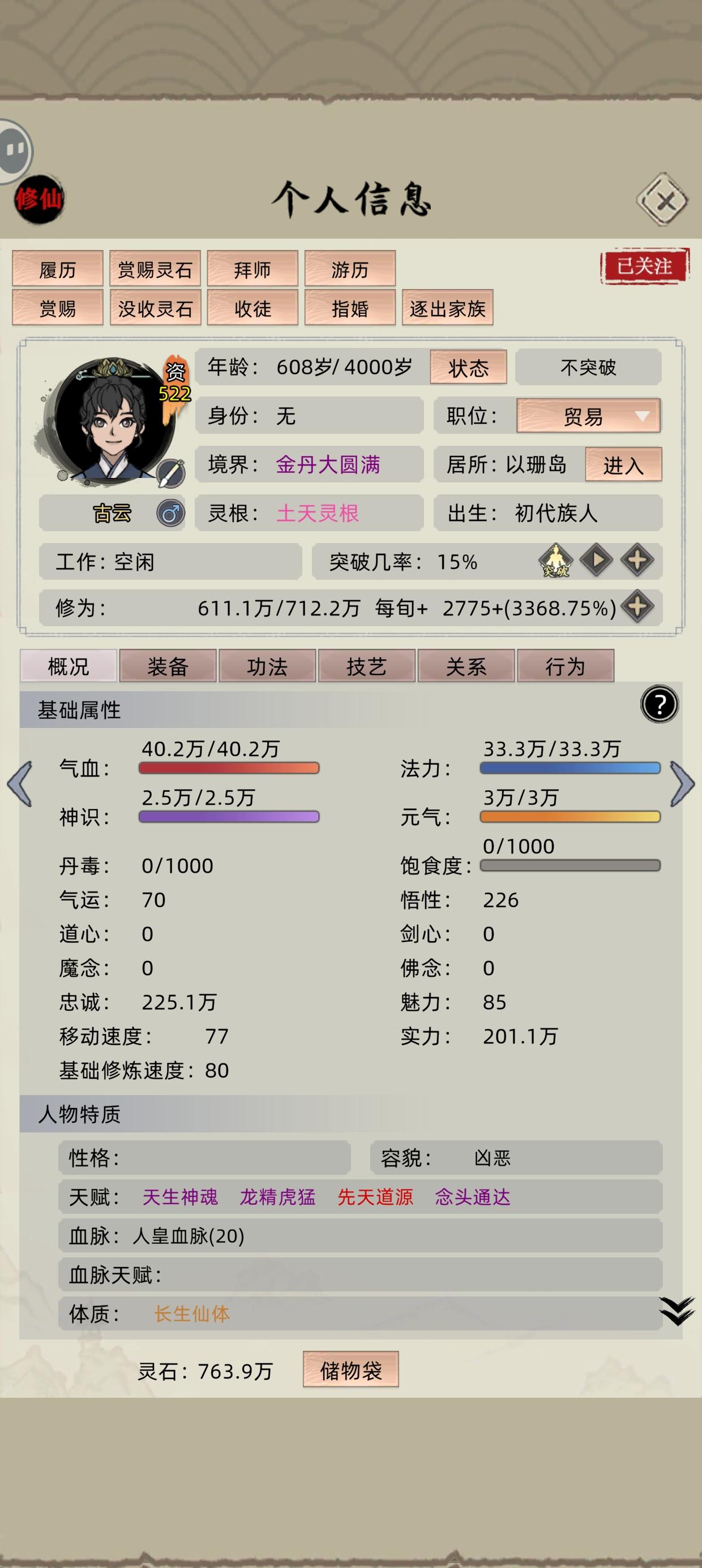 李青侯到手,血脉就收集完了,麒麟,巨魔,鲲鹏,3血脉收集完成。剩下的就是配体质了,不过也好配,毕竟全部名人都抓过来了。这个档很顺利,开局遇到朝夕问道花,直接老祖化神2了,100多年把全部名人都抓过来了。要不是升级升仙台没材料(拿仙道升仙令),耽误点时间,早配好了。算是最顺利的一个档。