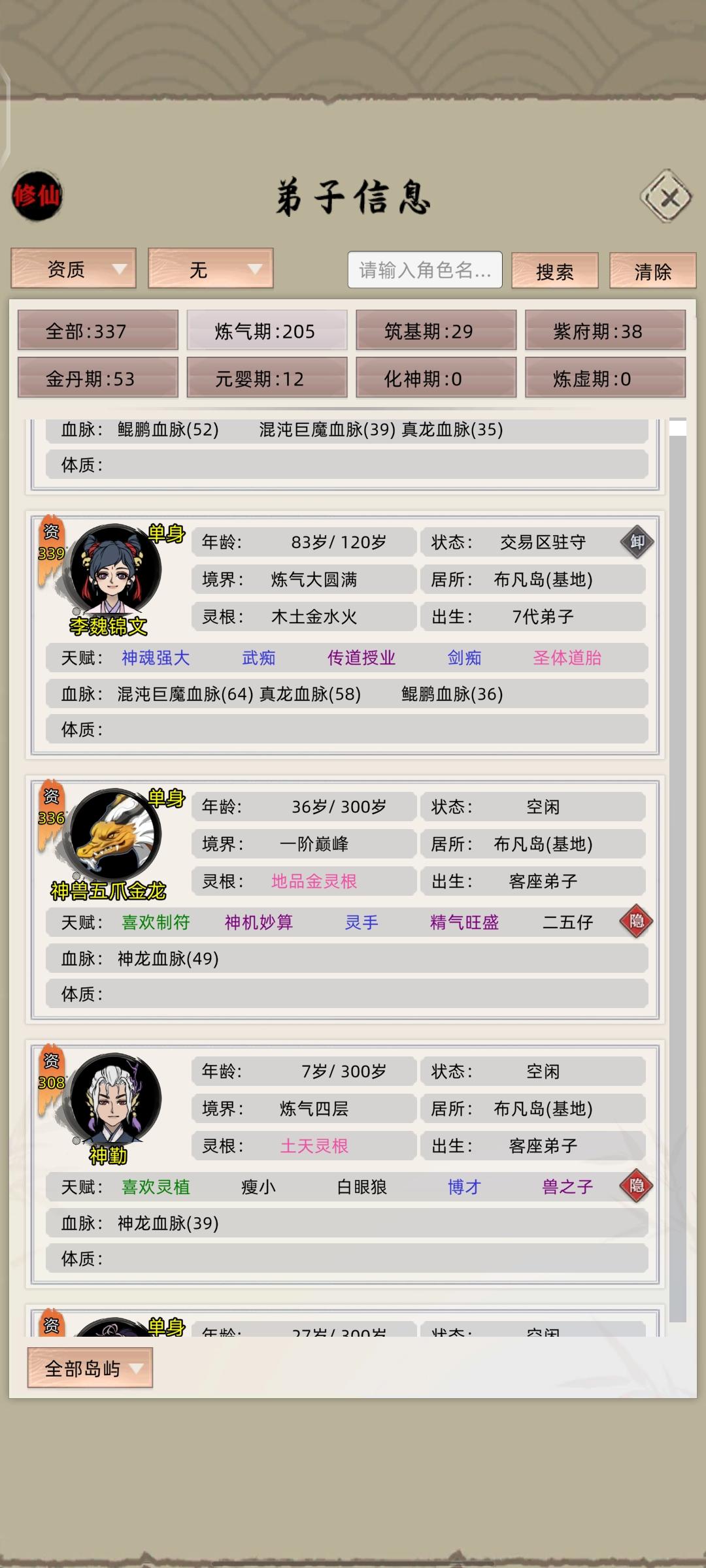 在游玩的过程中,我突然想到这个游戏目前最强的搭配是什么样的?为了探究这个,我仔细研究了人物的血脉,经过我十几天的不懈努力,用各种办法得到了所有名人的血脉,于是,通过杂交育种,一代又一代的培养,终于得到了这个究极生物。法王仙体,所有血脉都与法术相关,并且拥有所有名人可传承的体质,目前我能想到的最好了。修炼速度高达4400,法术加成没统计,但是非常的高。 我通过母体加暖玉床加九龙单上品的配置,下