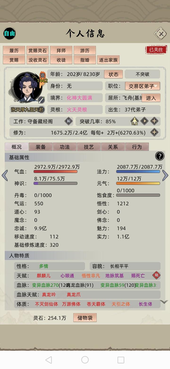 一,毕业人物成型参考模板基于第一篇的第四部分培养步骤依次进行可以培养出以上人物。二,面版重要部分培养出的人物,“命中率”“先手速度”应在此数值左右。三,功法搭配以下是部分搭配,每种灵根搭配不同,但思路相同。以上功法搭配思路为 :主修:梵圣真魔功+群伤物理主修(如时冰宝典)+先手主修自创辅修:极寒风雪功+群伤物理辅修(如开天剑诀)+爆伤辅修自创+归元剑典下部+优先群伤物理辅修/洞天剑
