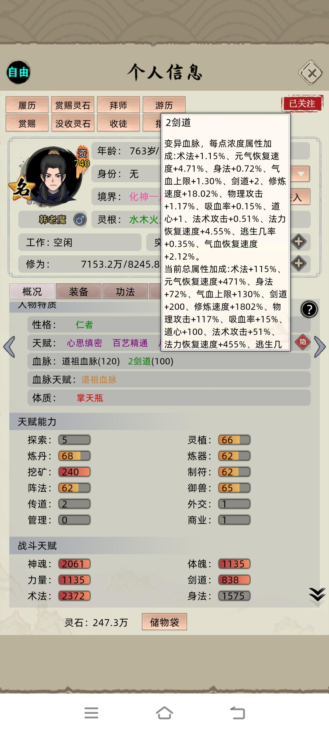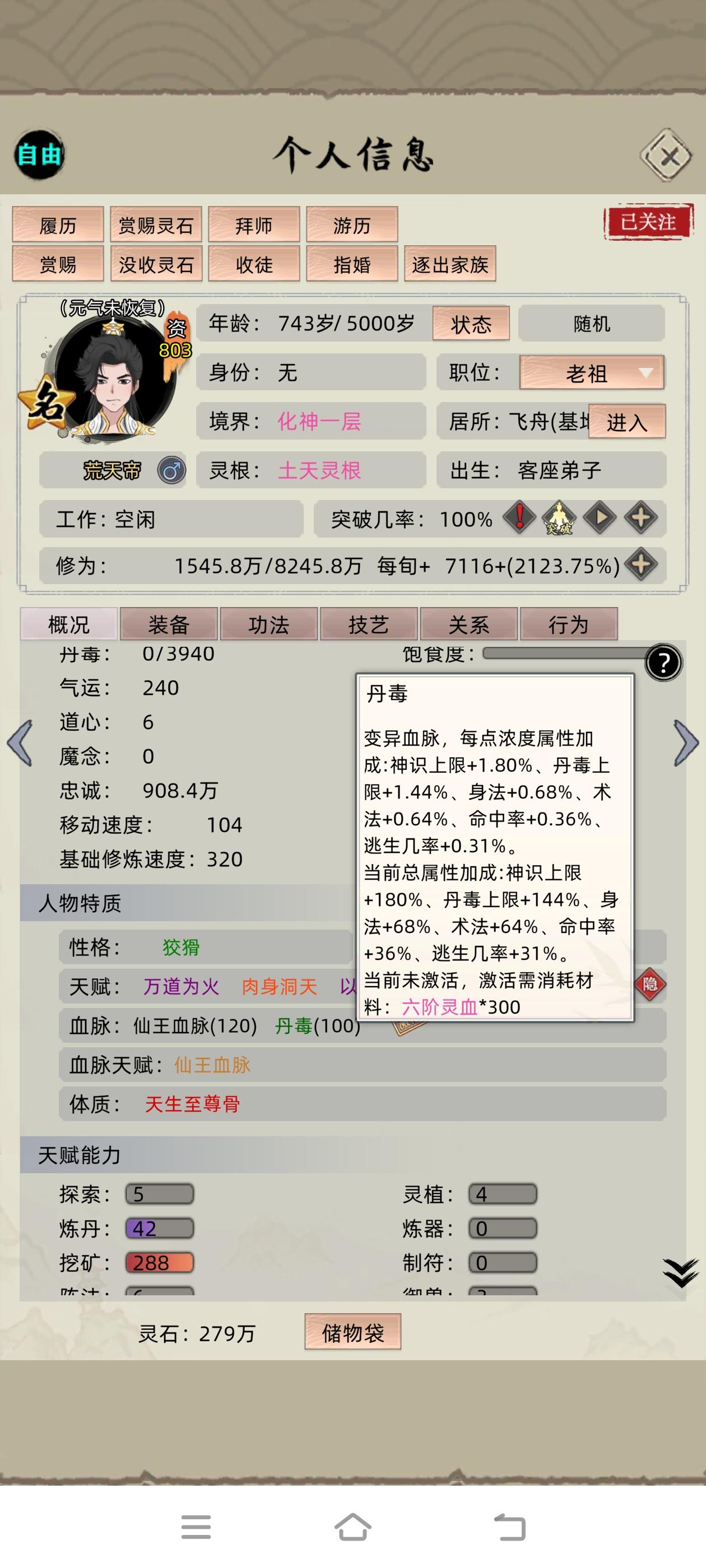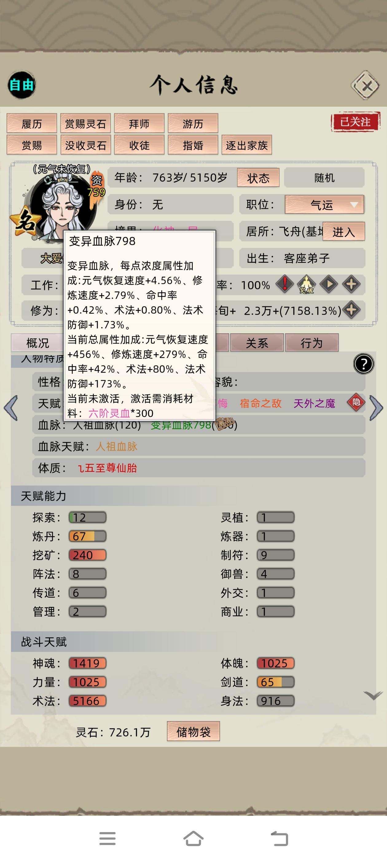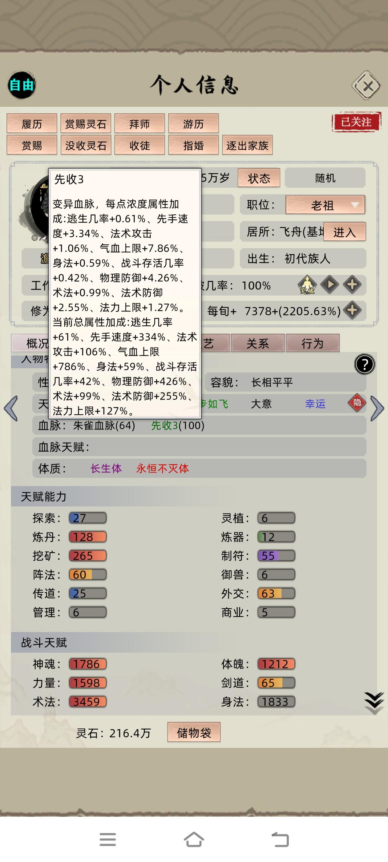 这个档也差不多要完结了,老祖走的是防御流,亲测后期化神随出防御型血脉可以一打多名人我当时化神是上个版本的事情所以只搞了个轮回法则,最好的是现版本的空间法则,当然感觉对我现在影响不大,然后化神之后一个个抓名人就行,之后如愿培养出了三血脉,然后特意上个版本没更新卡出了六血脉,之后更新,新版升级到血脉值120