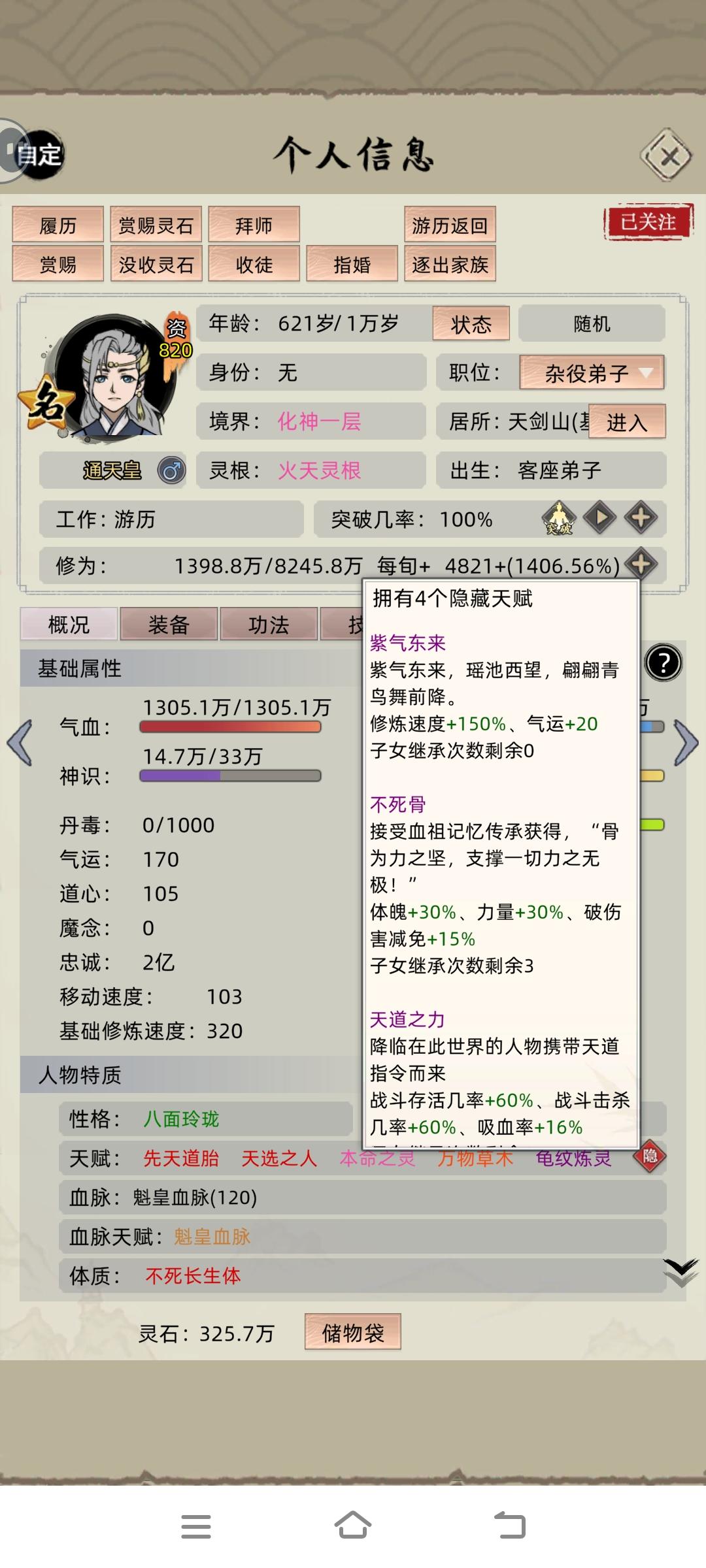 这个档也差不多要完结了,老祖走的是防御流,亲测后期化神随出防御型血脉可以一打多名人我当时化神是上个版本的事情所以只搞了个轮回法则,最好的是现版本的空间法则,当然感觉对我现在影响不大,然后化神之后一个个抓名人就行,之后如愿培养出了三血脉,然后特意上个版本没更新卡出了六血脉,之后更新,新版升级到血脉值120