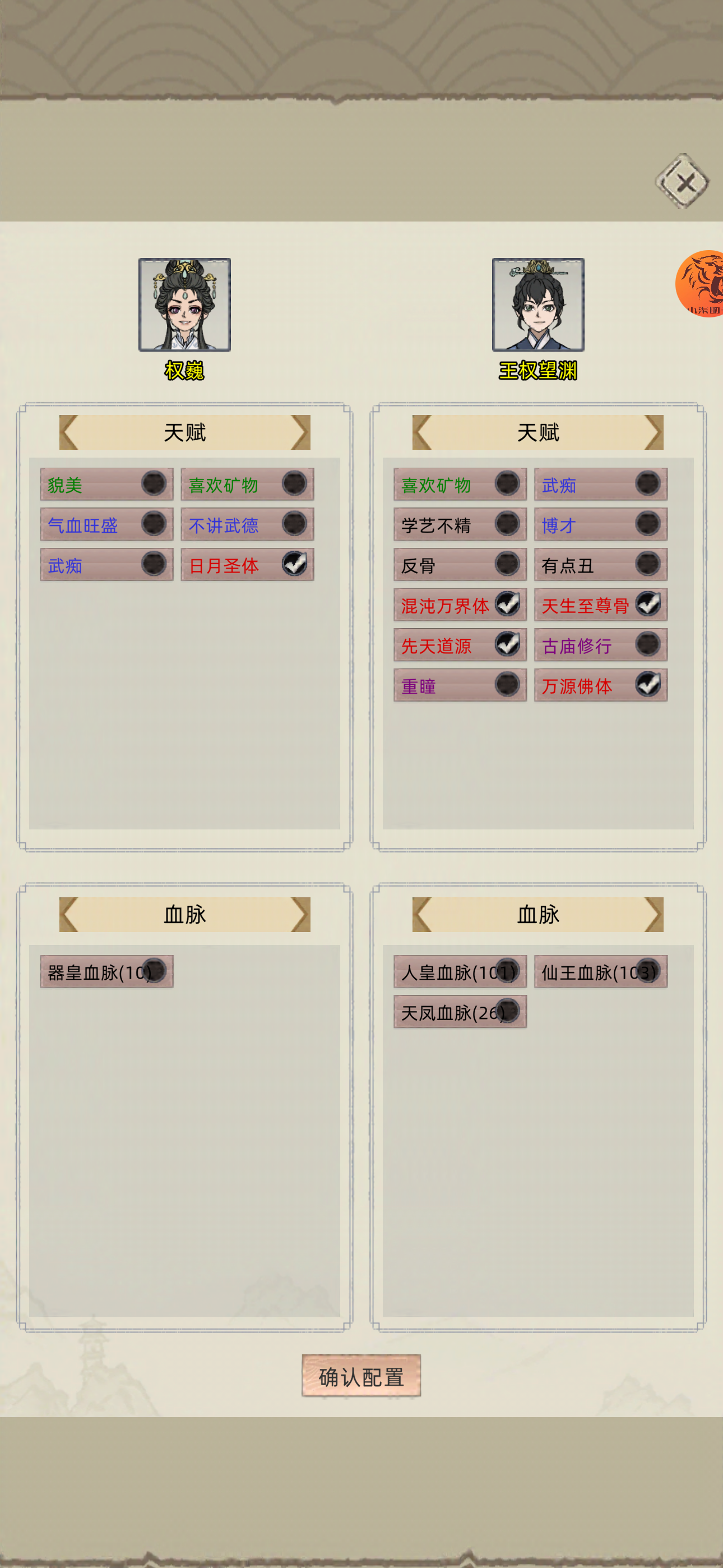 李青侯到手,血脉就收集完了,麒麟,巨魔,鲲鹏,3血脉收集完成。剩下的就是配体质了,不过也好配,毕竟全部名人都抓过来了。这个档很顺利,开局遇到朝夕问道花,直接老祖化神2了,100多年把全部名人都抓过来了。要不是升级升仙台没材料(拿仙道升仙令),耽误点时间,早配好了。算是最顺利的一个档。