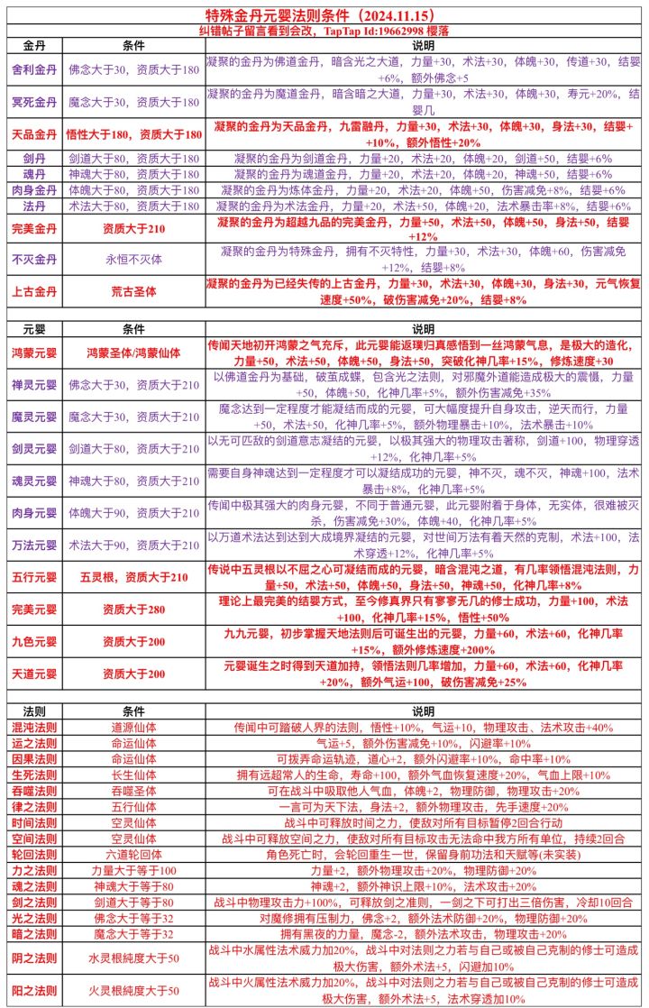 点赞顶帖,多张图片自取~主要内容看图★图1~筑基&金丹条件★图2~元婴&法则★图3~紫府异象大全(方便查看)★图4~丹方大全(方便炼丹,其它丹药阵法炼器符箓全靠买和抢)★图5~职位设置,数字是资质自行设置。玩配种的就别看了★图6~9.0版本之前的紫府异象攻略★图7~9.0版本之前的特殊金丹元婴法则大全(一到九品全靠随机)★图8图9天南地图,有点糊不介意可以看看,游戏里