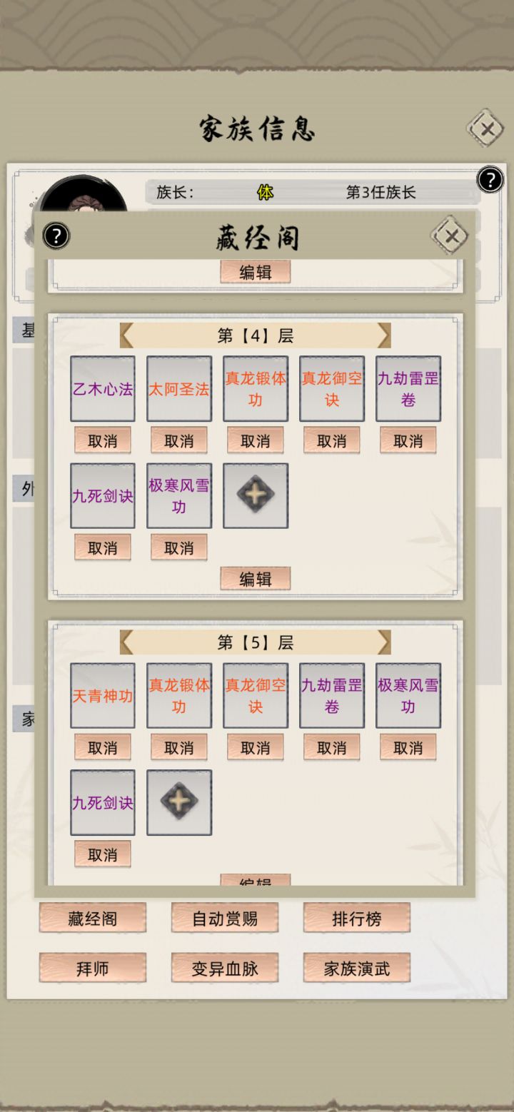 第一:藏经阁设置:1: 在最上面【第0层】不要打开编辑,直接放入 【龙蟒】【血灵】【凝元】,就这三个直达金丹。2:在【第一层】打开编辑, 境界设置 【金丹一层】—【元婴圆满】, 【悟性0—5000】, 【资质,剑道,血脉0—5000】。 这一层放入【太阿】【真龙锻体】【真龙御空】, 【乙木】【九劫】【九死剑】【极寒风雪】。 这一层适合所有灵根,包上化神。3:这里解释下为啥这样设