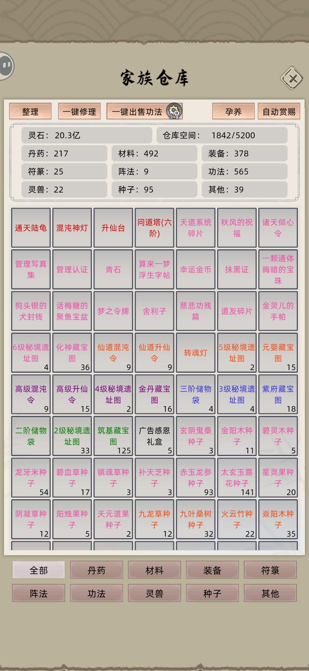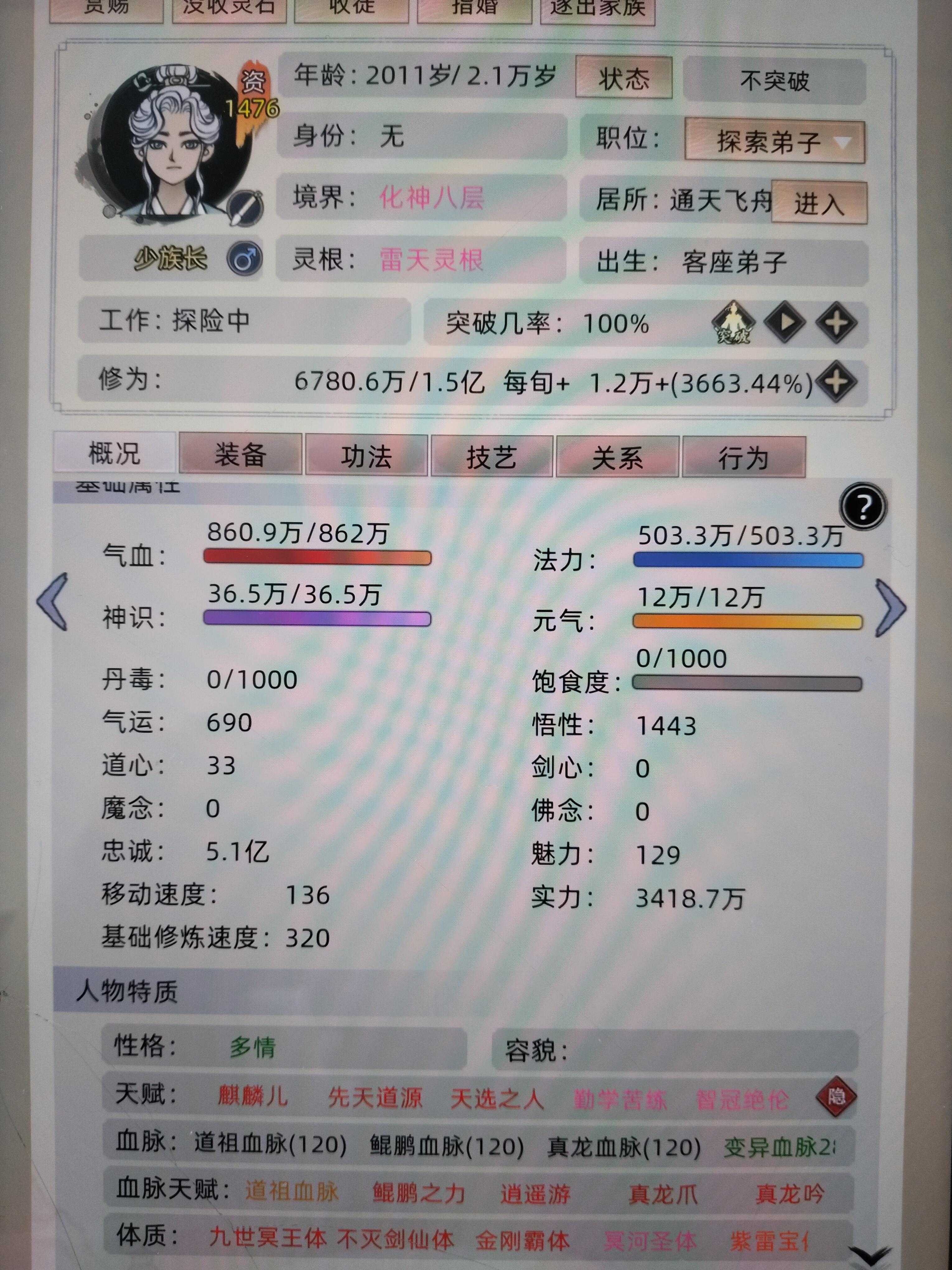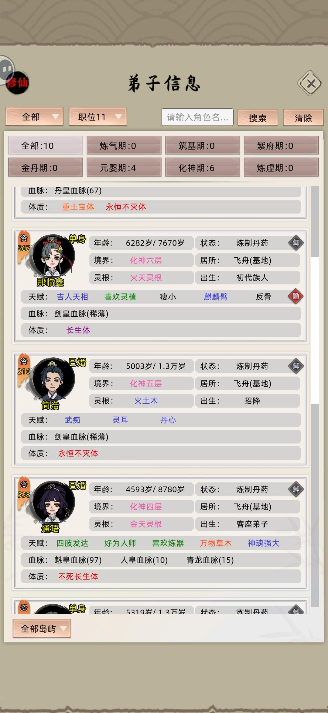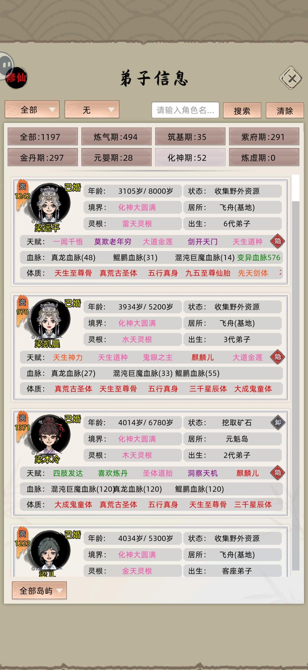 李青侯到手,血脉就收集完了,麒麟,巨魔,鲲鹏,3血脉收集完成。剩下的就是配体质了,不过也好配,毕竟全部名人都抓过来了。这个档很顺利,开局遇到朝夕问道花,直接老祖化神2了,100多年把全部名人都抓过来了。要不是升级升仙台没材料(拿仙道升仙令),耽误点时间,早配好了。算是最顺利的一个档。