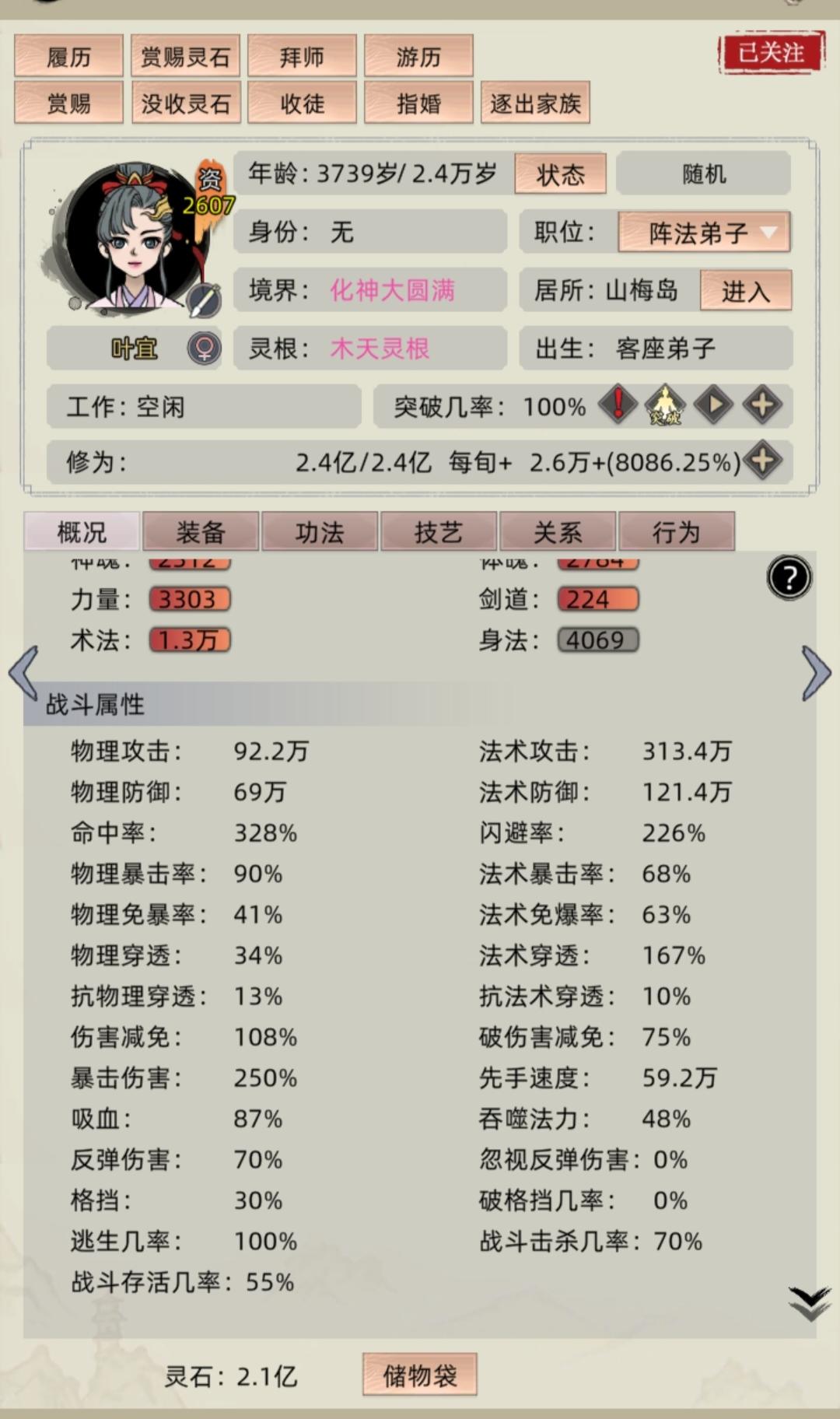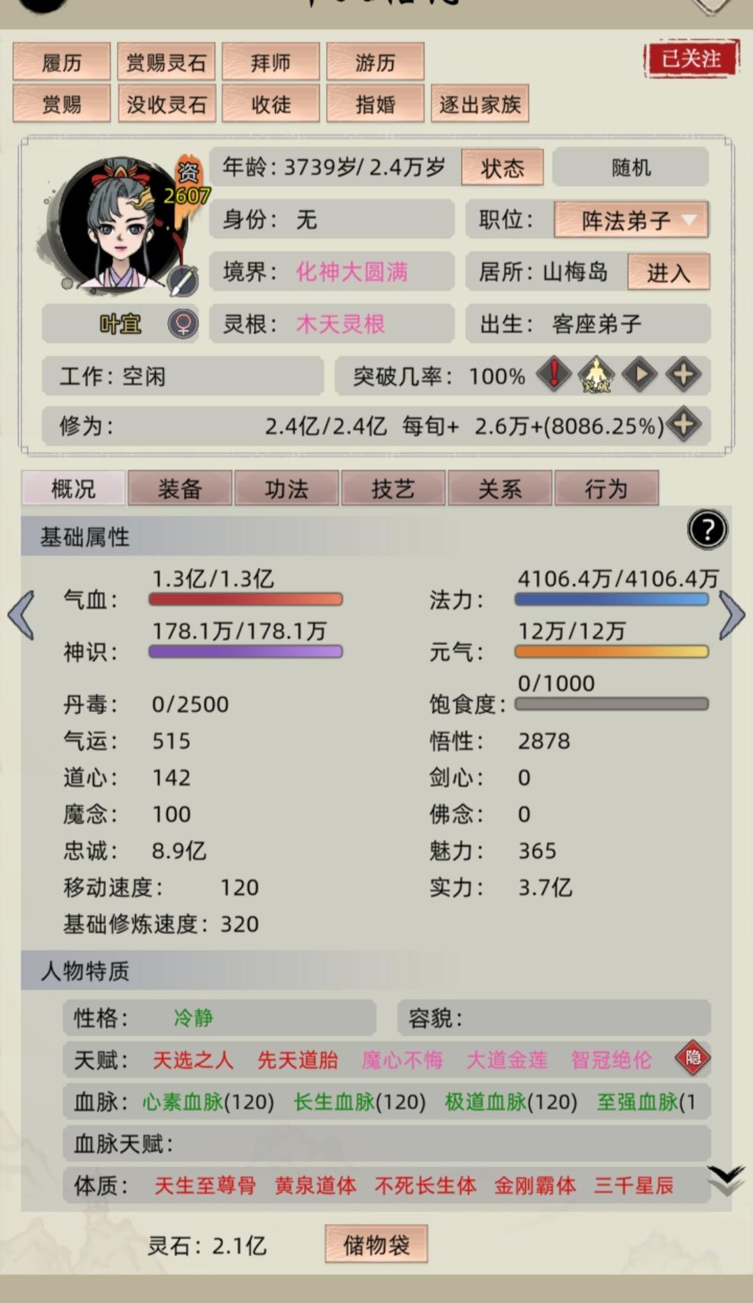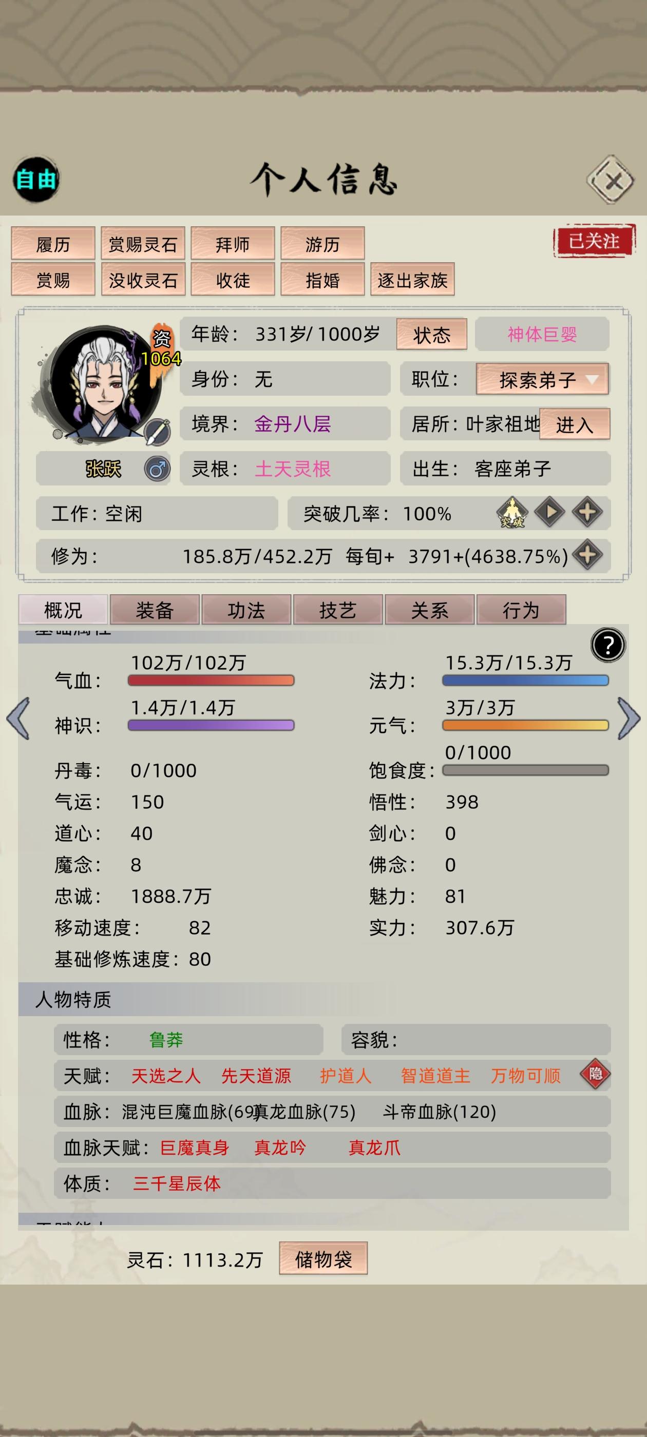 李青侯到手,血脉就收集完了,麒麟,巨魔,鲲鹏,3血脉收集完成。剩下的就是配体质了,不过也好配,毕竟全部名人都抓过来了。这个档很顺利,开局遇到朝夕问道花,直接老祖化神2了,100多年把全部名人都抓过来了。要不是升级升仙台没材料(拿仙道升仙令),耽误点时间,早配好了。算是最顺利的一个档。