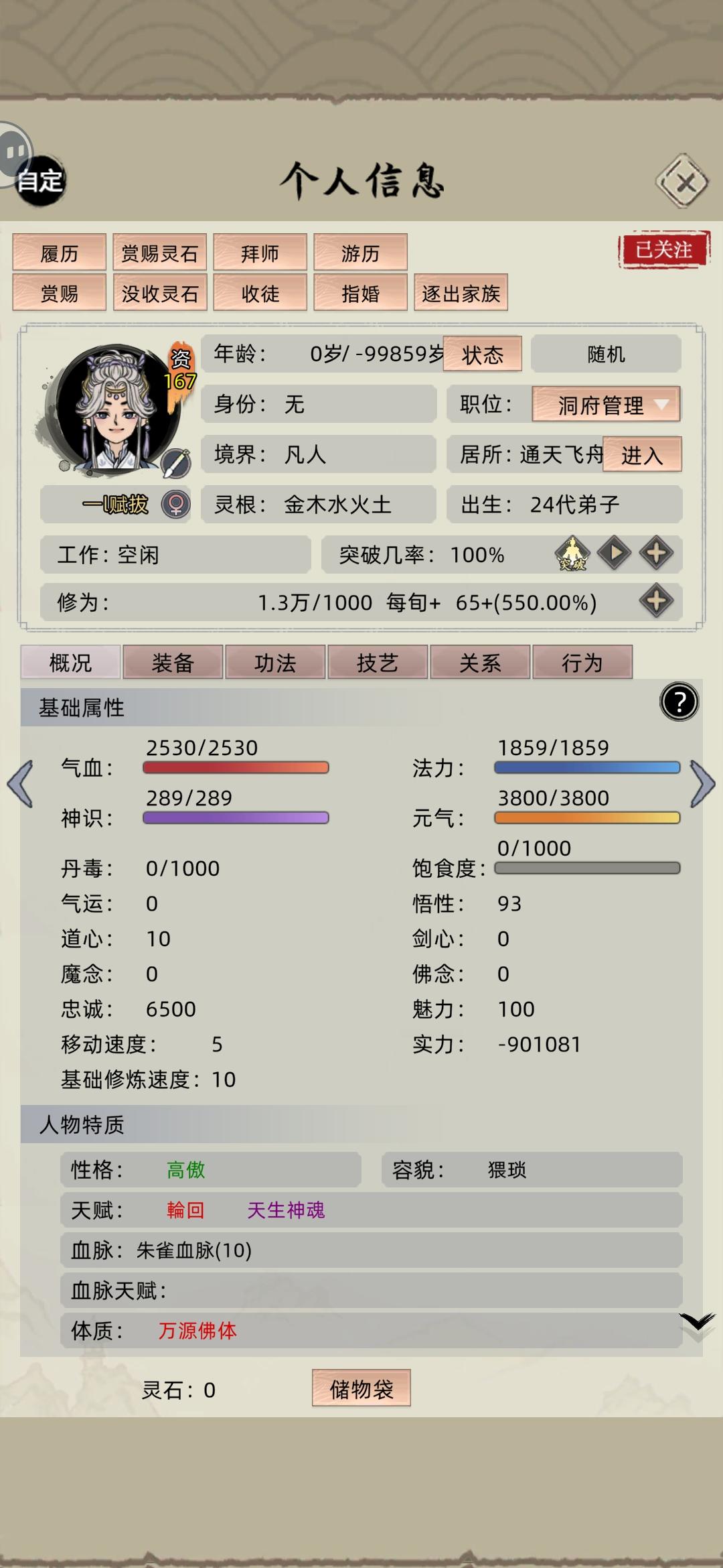 李青侯到手,血脉就收集完了,麒麟,巨魔,鲲鹏,3血脉收集完成。剩下的就是配体质了,不过也好配,毕竟全部名人都抓过来了。这个档很顺利,开局遇到朝夕问道花,直接老祖化神2了,100多年把全部名人都抓过来了。要不是升级升仙台没材料(拿仙道升仙令),耽误点时间,早配好了。算是最顺利的一个档。