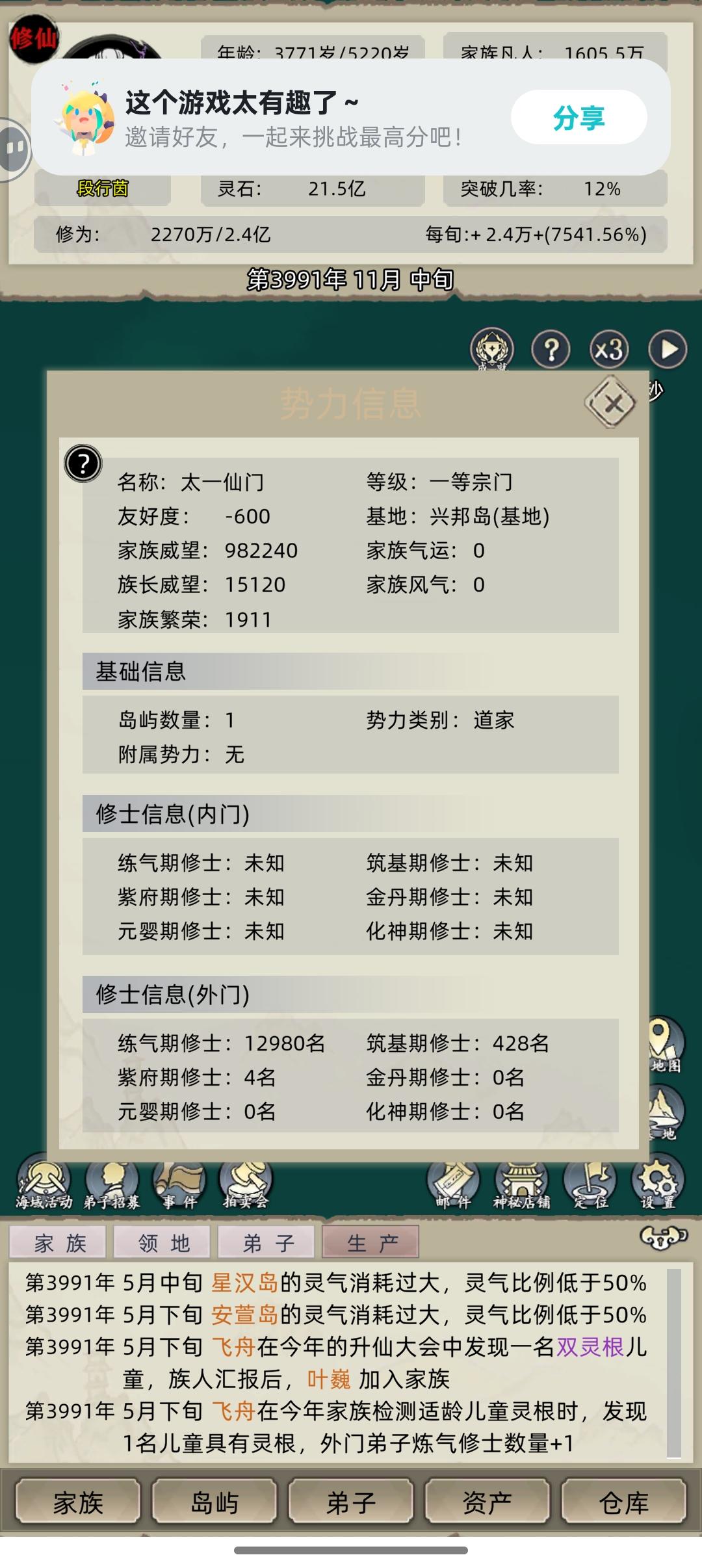 各位亲爱的道友,修仙家族模拟器将于9月10号进行大版本更新更新时间:9月10日更新,本次更新暂时只有安卓版本,苹果版本需要等待这几天安卓版本稳定后进行提交更新具体更新时间:预计在10号下午(上午我们会提交版本)目前版本已经准备完毕,虽然有很多问题,但是勉强可以玩了,介意的道友可以等我们几天版本稳定了在玩,目前版本不稳定期间,可能会出现坏存档,报错等问题,我们一定会及时抓紧修复更新方式:大