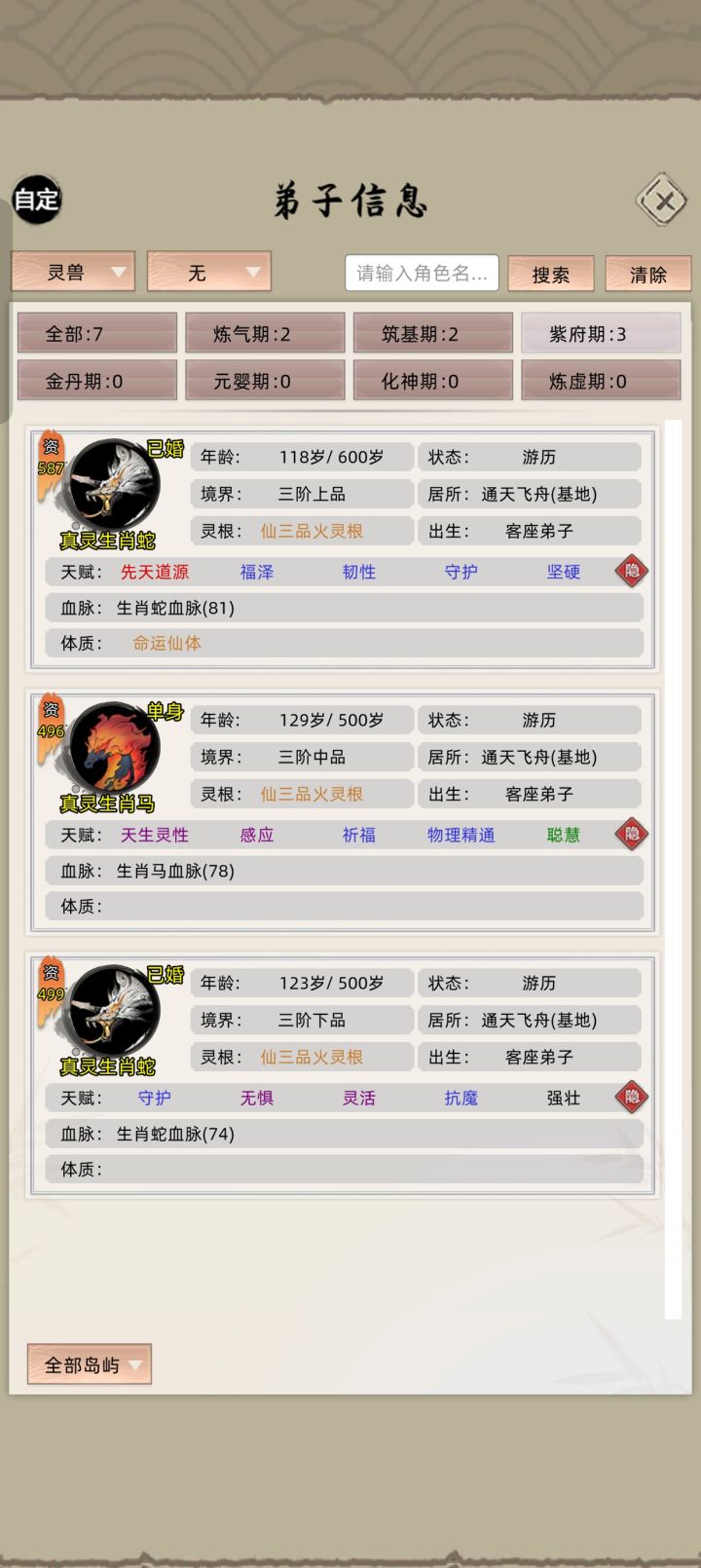 一、开局准备:1.首先随意游玩其他相对简单的模式,攒齐宝物,在祖宗祠堂放入满级暖玉床、血灵池、混沌珠、小绿瓶、玄章玉箓、大道荒塔。 2.进行一次试玩,选出通天飞舟和紫府长老,通过SL寻找可以攻占的微型岛屿,攻占后暂停,鼠标连点外门弟子转换,招收至少2000名弟子完成仙族巨擘成就,存档正常游玩一段时间,完成筑基众多和仙人之下等资质相关成就,即可得到39天赋点。 3.进行二次试玩,通过比一次试玩