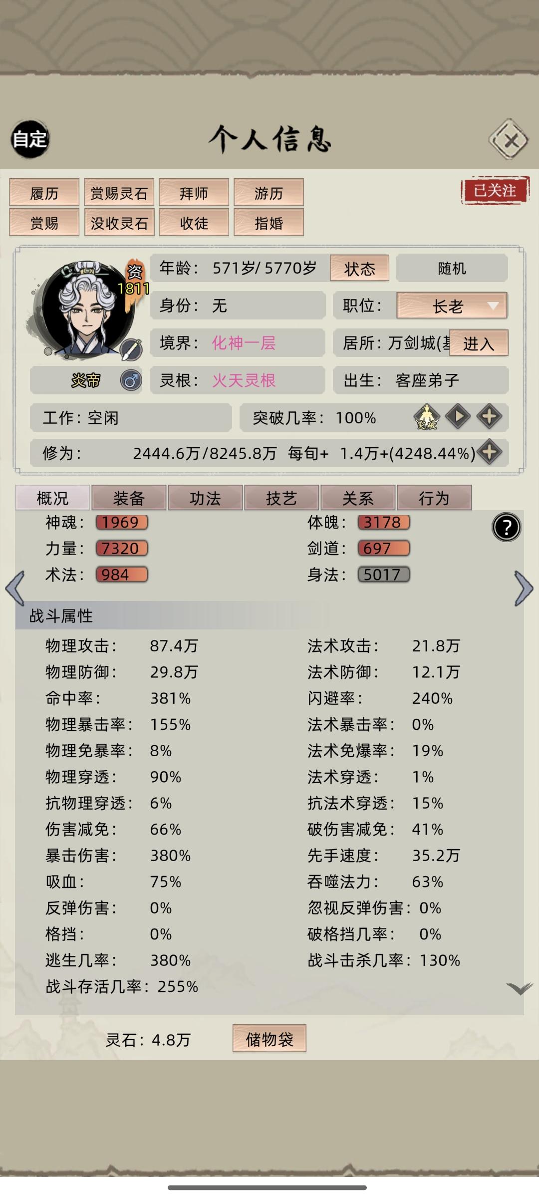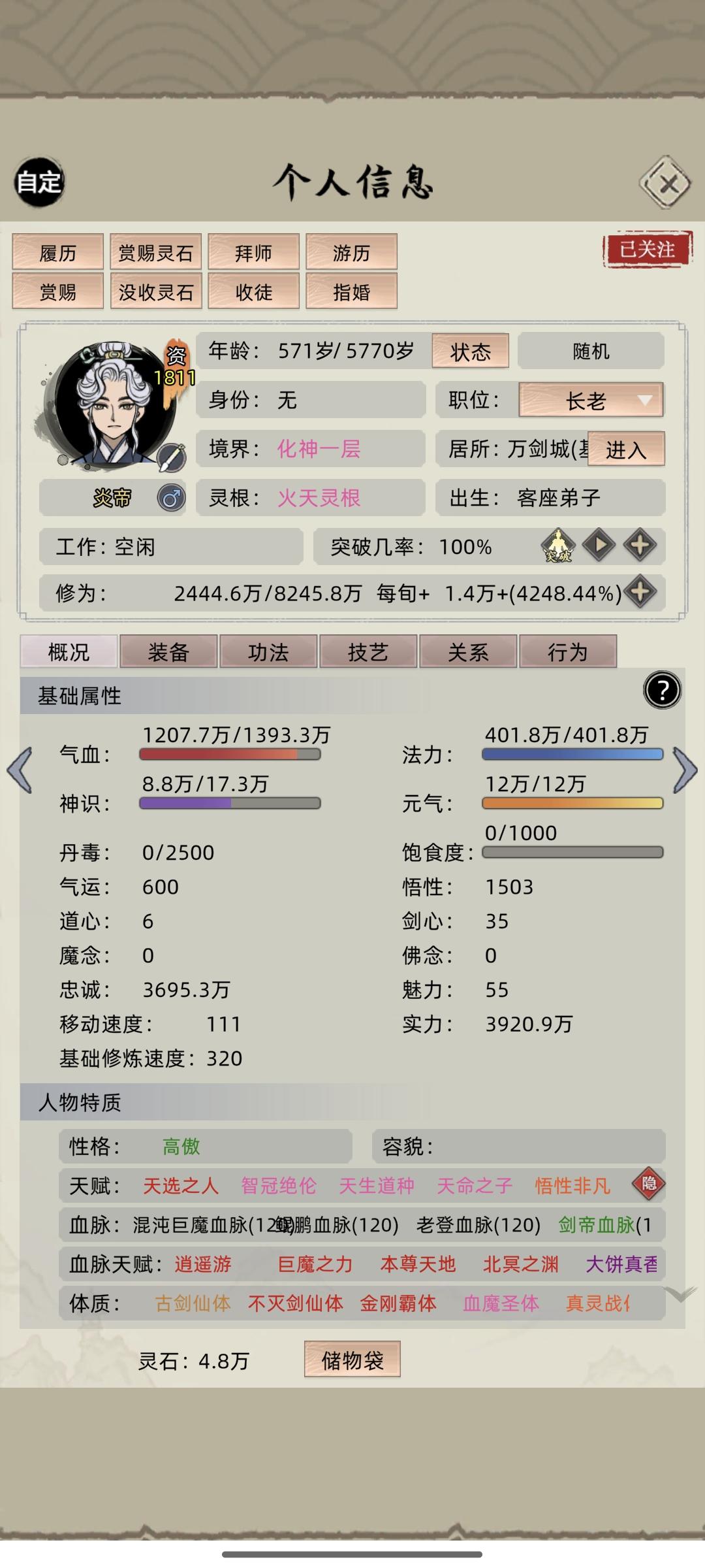 李青侯到手,血脉就收集完了,麒麟,巨魔,鲲鹏,3血脉收集完成。剩下的就是配体质了,不过也好配,毕竟全部名人都抓过来了。这个档很顺利,开局遇到朝夕问道花,直接老祖化神2了,100多年把全部名人都抓过来了。要不是升级升仙台没材料(拿仙道升仙令),耽误点时间,早配好了。算是最顺利的一个档。