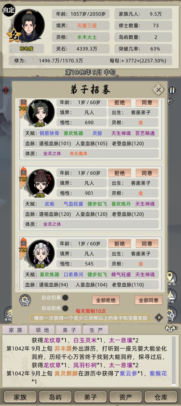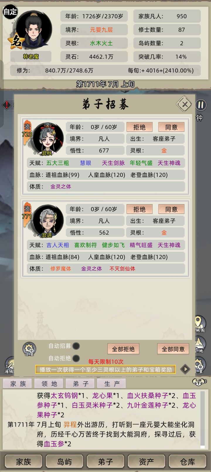 N年了,灵界也该放出来了吧?一直卡在化神,炼虚都玩不了,很没意思的,光加些新玩法也撑不了多久,一味的消耗我们这些老玩家情怀,越是赞助越是没意思。哪怕不开灵界,那也该弄一下新境界,炼虚、合道、大乘什么的,多放几个出来。至于新玩法,大概想的也就那么几个。1、开放玩家主持拍卖会的功能,可以是一二等家族以后开放。2、开放纳妾,不说多的,一个修仙背景的世界,必须一夫一妻吗,不要多,你来个平妻和正妻两位置也行啊。3、妖兽、灵兽、真灵、神兽,建议能通过游历获得机缘,比如化形草之类的,化成人形,合理跟家族苗子结婚,要么某个境界能化形。4、轮回玩法需要强化一下,让老祖能够更好的轮回,也别出以前的bug了,不是失分,就是老祖很多年都不见得回来。6、夺舍,化神还是元婴以后的苗子在寿命将近的时候,可以在游历过程中,或者随机事件,或者通过道具定向夺舍族人或俘虏,重活一世,保留部分天赋,和已经修炼的功法,职业等级什么的,重头开始练很累的。7、重置初始六皇血,一个血脉比一个血脉的强,结果初始的六皇血毛都没有了,一削再削,玩个锤子了,还不如开局不选血脉的了,直接找没血脉的老祖一个人配种。8、增加家族嫡系、支脉,嫡系以老祖和族长为标准,支脉可以分家,形成如:林氏家族1支脉、林氏家族2支脉,发展像正常的npc势力就行,也可以随机事件发生,比如支脉出现某个名人,或者强天赋,不甘心屈居人下,想要让自己的支脉独立,背弃主家嫡系,自立为王。9、如果可以,也能增加王朝仙族,家族到一定地步,可以建立仙庭什么的,统一建立什么阵营啊啥的10、功法DIY自创,高悟性天赋的苗子,有概率创造出带有神通的功法,概率地点都没事11、家族仓库,功法、装备之类的,实现和药材丹药一样的重叠,十个灵剑十个格子,越到后面越难翻,还很卡12、变异血脉的融合,后期变异血脉多了,也挺麻烦的,能不能出个道具,把特定的变异血脉融合,形成新的单一血脉,定向成主血脉,替换掉初始家族选择的血脉?13、游戏里强者数量归类化,让玩家可以在进入游戏开局后,任意时间段自定义如金丹、元婴、化神的强者数量,上限了,就没有资格继续突破,世界的承载量也有上限嘛,这样能不能更好控制后期全图人口泛滥,导致游戏变卡,越是后期,化神元婴就不说了,炼气、筑基、紫府这些跟韭菜似的,杀,杀不完,灭,灭不完,隔几年就来了几千个,也可以设定个限制,多少年后,会迎来一次灵气爆发,让设定好的数额上限被打破,发生变化