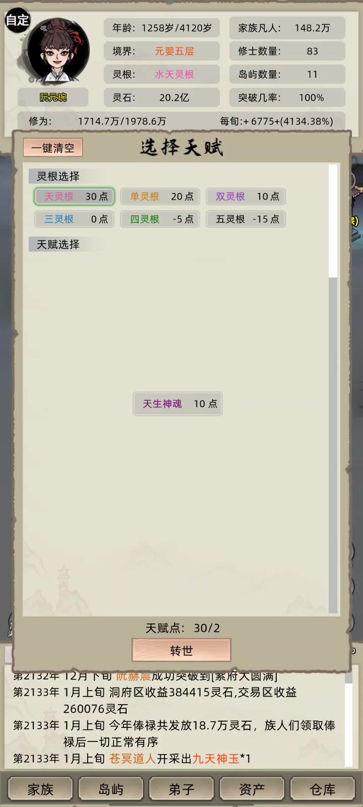 都是更新之后玩的,第二个视频是新档#修仙家族模拟器