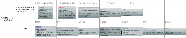 为了玩这游戏,查了论坛和贴吧大量帖子,做一个汇总整理帖子,这里只统计了可遗传后代的数据,无法遗传的体质和天赋没有列出来。功法搭配还没弄清楚,先不整理了。