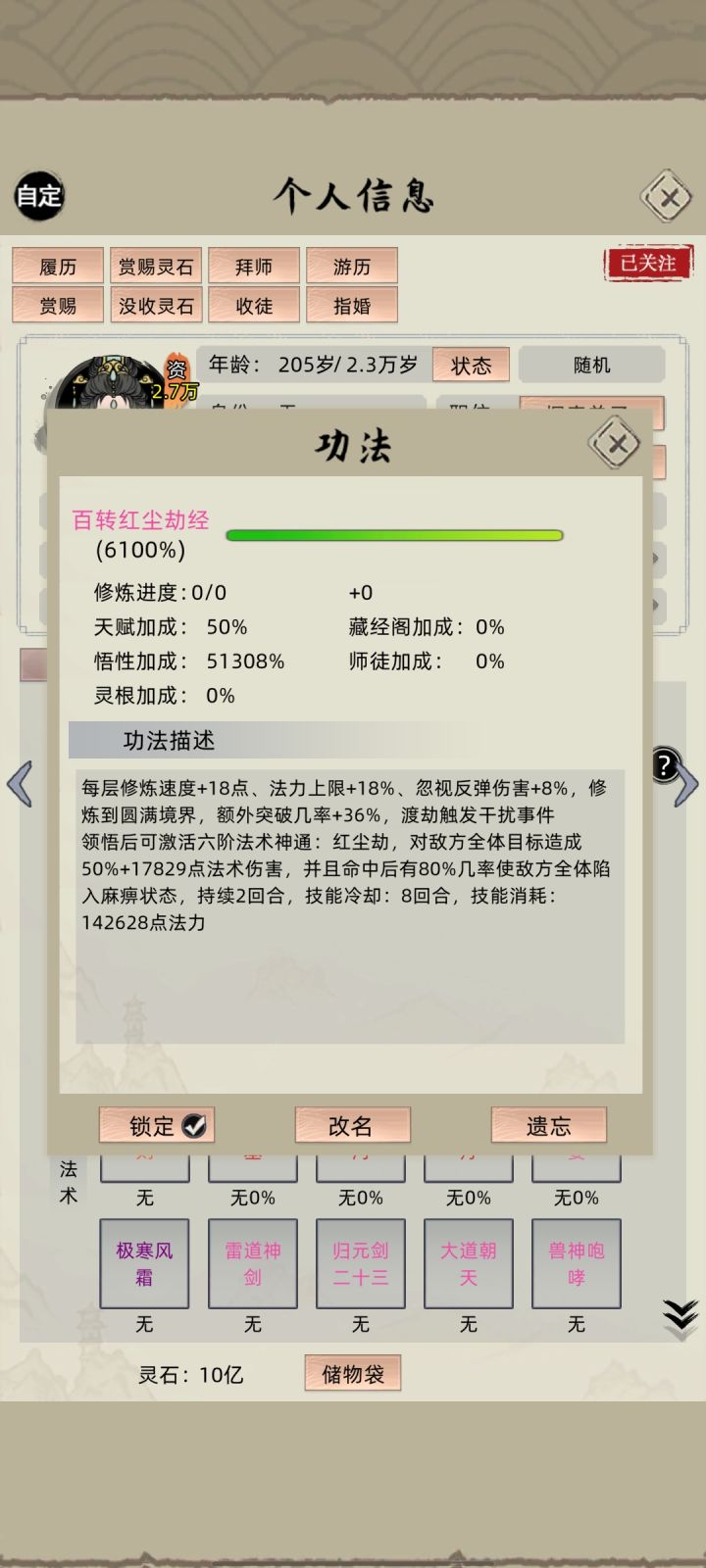 首先有请立地成佛。关于没实装的功法:估计所有概率加debuff的估计都没生效,测试了几个六阶定身的,剩下的就不一一测了。有一个据说能定身的五阶土系主修天地乾坤诀也没实装。但是火系有一本南明离火经可以群体定身。然后是单体的定身都是有用的。攻击后回血的功法没实装,佛道六阶回血功法没实装,木系实装了,以及我发现元婴用的天青术不能群奶化神。不过这点回复化神也看不上了。神识方面,六阶的不灭神识是