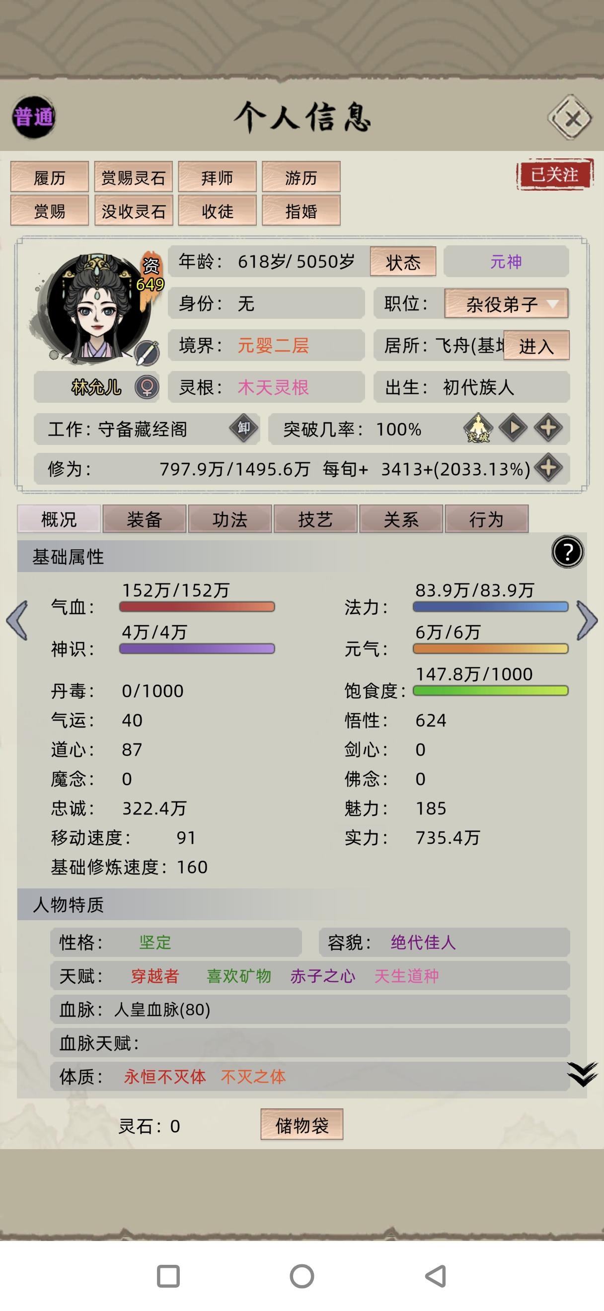 一,毕业人物成型参考模板基于第一篇的第四部分培养步骤依次进行可以培养出以上人物。二,面版重要部分培养出的人物,“命中率”“先手速度”应在此数值左右。三,功法搭配以下是部分搭配,每种灵根搭配不同,但思路相同。以上功法搭配思路为 :主修:梵圣真魔功+群伤物理主修(如时冰宝典)+先手主修自创辅修:极寒风雪功+群伤物理辅修(如开天剑诀)+爆伤辅修自创+归元剑典下部+优先群伤物理辅修/洞天剑