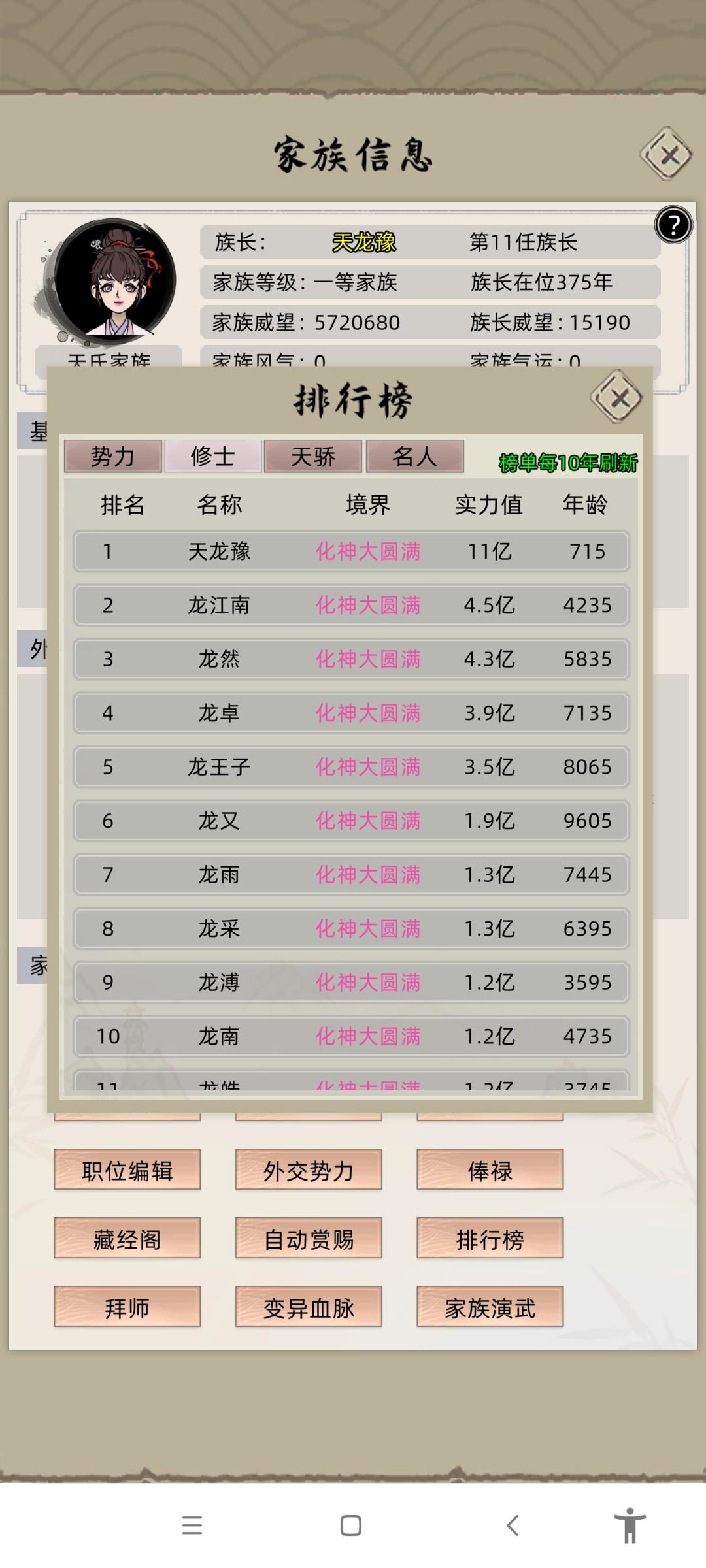 这个档也差不多要完结了,老祖走的是防御流,亲测后期化神随出防御型血脉可以一打多名人我当时化神是上个版本的事情所以只搞了个轮回法则,最好的是现版本的空间法则,当然感觉对我现在影响不大,然后化神之后一个个抓名人就行,之后如愿培养出了三血脉,然后特意上个版本没更新卡出了六血脉,之后更新,新版升级到血脉值120