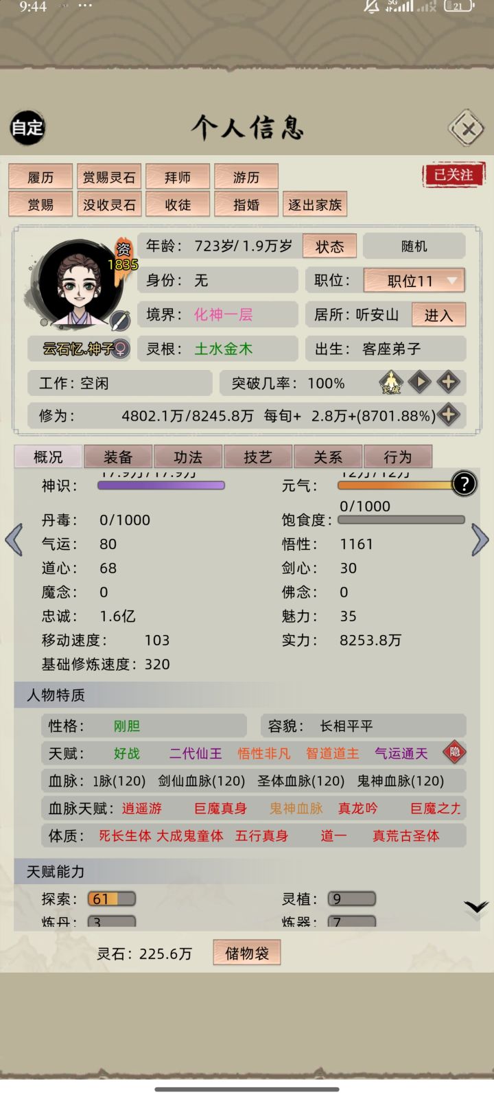 这个档也差不多要完结了,老祖走的是防御流,亲测后期化神随出防御型血脉可以一打多名人我当时化神是上个版本的事情所以只搞了个轮回法则,最好的是现版本的空间法则,当然感觉对我现在影响不大,然后化神之后一个个抓名人就行,之后如愿培养出了三血脉,然后特意上个版本没更新卡出了六血脉,之后更新,新版升级到血脉值120