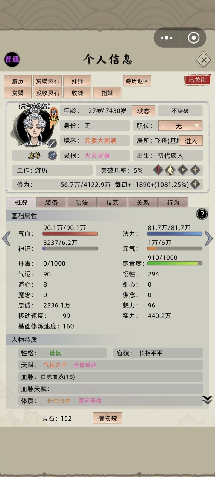 首先有请立地成佛。关于没实装的功法:估计所有概率加debuff的估计都没生效,测试了几个六阶定身的,剩下的就不一一测了。有一个据说能定身的五阶土系主修天地乾坤诀也没实装。但是火系有一本南明离火经可以群体定身。然后是单体的定身都是有用的。攻击后回血的功法没实装,佛道六阶回血功法没实装,木系实装了,以及我发现元婴用的天青术不能群奶化神。不过这点回复化神也看不上了。神识方面,六阶的不灭神识是