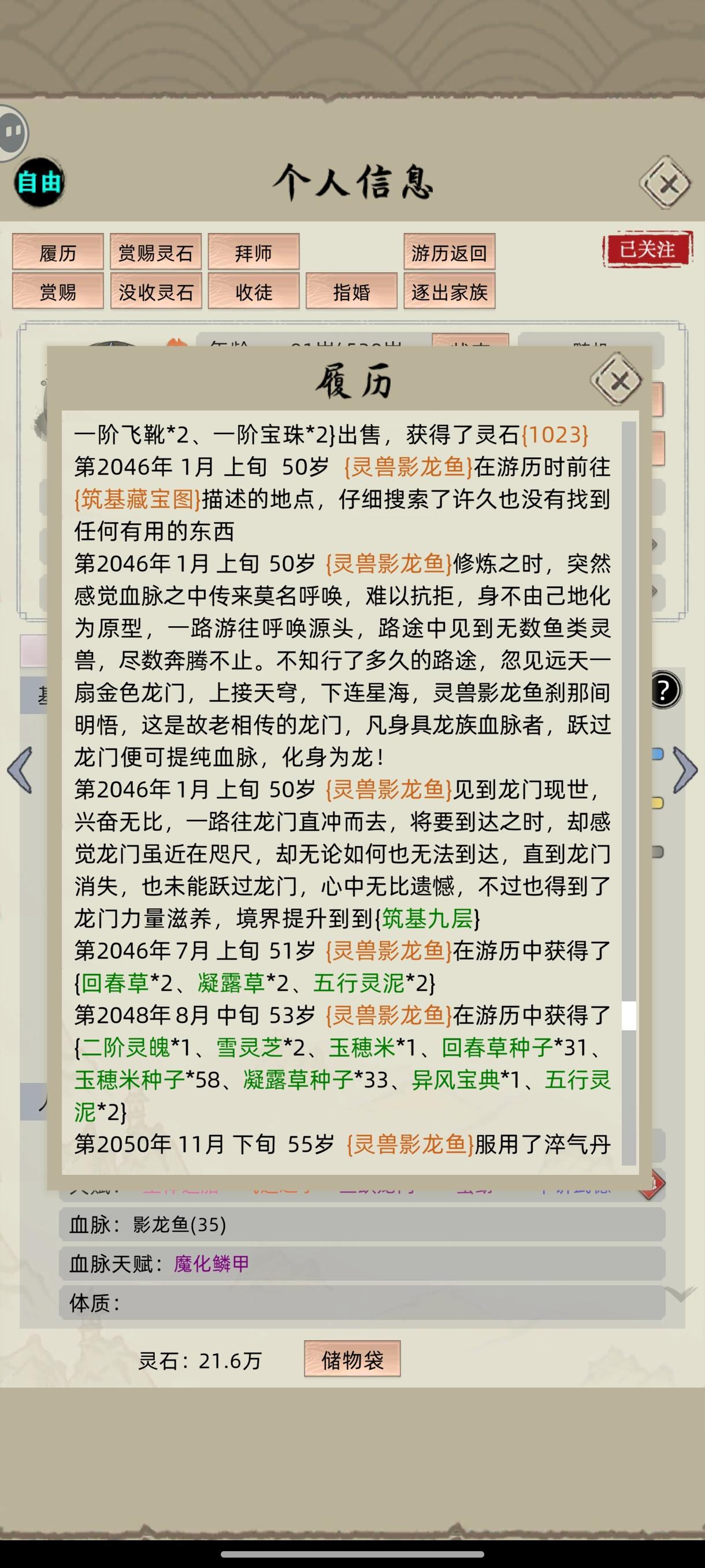 李青侯到手,血脉就收集完了,麒麟,巨魔,鲲鹏,3血脉收集完成。剩下的就是配体质了,不过也好配,毕竟全部名人都抓过来了。这个档很顺利,开局遇到朝夕问道花,直接老祖化神2了,100多年把全部名人都抓过来了。要不是升级升仙台没材料(拿仙道升仙令),耽误点时间,早配好了。算是最顺利的一个档。
