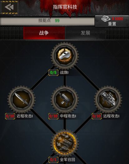科技分为两个部分:战争类主要是对部队、兵种属性类的加成,发展类主要是对建筑速度、资源获取等方面的加成。指挥官们可以通过技能点升级对应的科技。 建议各位指挥官在前期可以优先升级发展类,中后期花费1000黄金或者使用角色技能重置道具重置,主升战争类。指挥官们可以根据自己的实际情况进行选择~ 指挥官们也可以从指挥官科技树状图发现,当科技达到一定阶段时会开启特定的主动技能。目前科技中,共有7个需手动释放