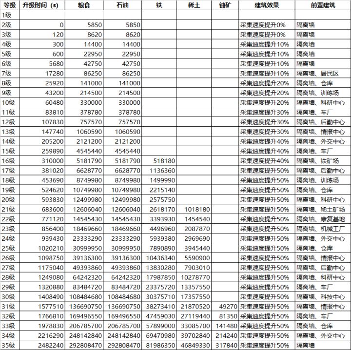 【游戏攻略】建筑资源消耗表(第一波)