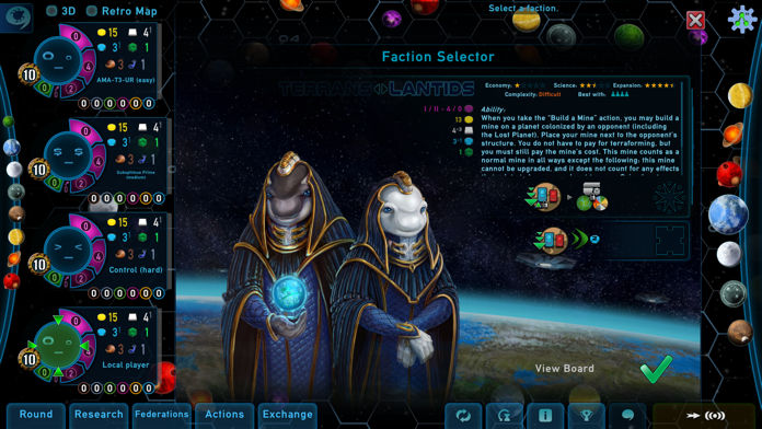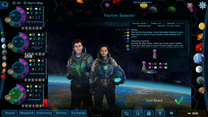 在盖亚计划中,每个玩家将控制14个种族中的一个,努力在神秘的泰拉星系中进行和平殖民。每个种族都有不同的星球环境生存需求。这些需求驱使着各种族熟练掌握了星球改造技术,使他们能够将不同类型的星球改造成宜居星球。
