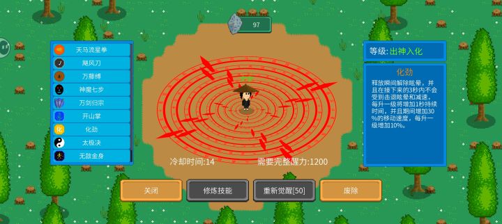 然后是一些实用类技能,神魔七步和无敌金身,神魔七步可以在小范围内瞬移,而且CD很短,还能用它来拉扯敌人和躲技能,比如万藤缚天马流星拳万剑归宗之类的。金身练到出神入化可以10秒内无敌,但只是敌人不能对你造成伤害,技能的击退还是会有。