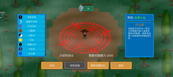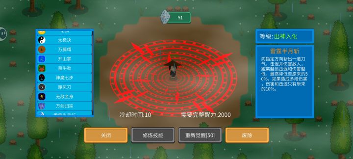 然后是一些控制类的技能(按个人觉得强弱来排列)开山掌和万藤缚太极决还有个人觉得最强,前两者都可以直接将敌人控在原地,且都有不俗的伤害。而太极决则是功能性较强,能够极大地减速敌人还能够减伤。然后是万剑归宗和雷霆半月斩蛮牛劲,万剑归宗减速,雷霆半月斩硬控和击退,有效范围大概有半个地图大,蛮牛劲和雷霆半月斩效果一样,但自身蓝量决定了蛮牛劲的技能效果,如果蓝量见底了最多只能冲一下,最后是天马流星拳,天马流星拳是直线攻击,有效范围和雷霆半月斩差不多,但不如雷霆半月斩的地方就在于它是单体伤害,面对多名敌人就不行了,而且技能方向是由移动轮盘决定的,也就是你面向哪个方向技能就朝哪释放,如果想要技能全打中基本上只能站在原地。(控制类技能都可以用化劲来解)