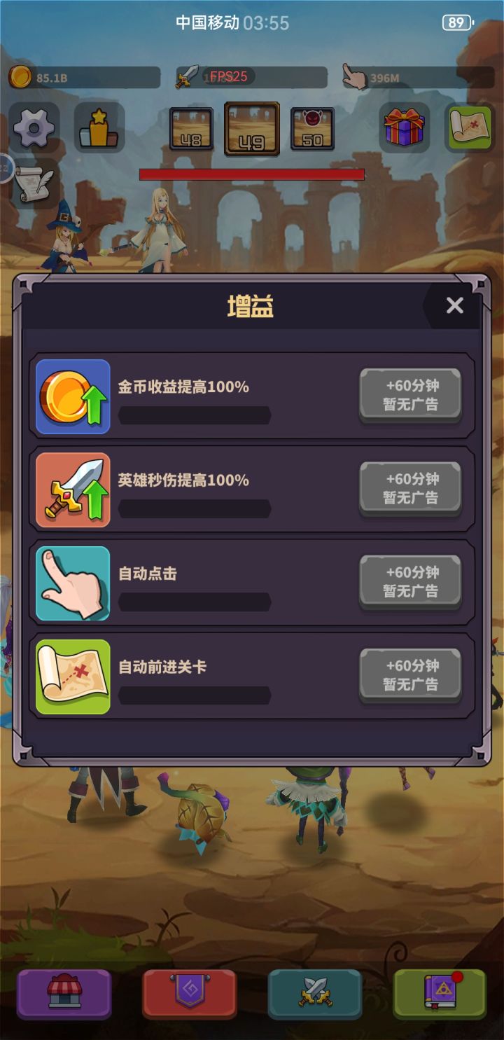 就是一个纯挂机点击的半成品。广告没弄好。玩到第10关boss的时候就开始卡起来。越往后越卡。第十五关boss已经是定格幻灯片了。20关基本画面不动了。不知道是不是我手机这样,而且这个卡的效果关闭游戏清后台根本不起作用。设置中的降耗功能也几乎完美没用