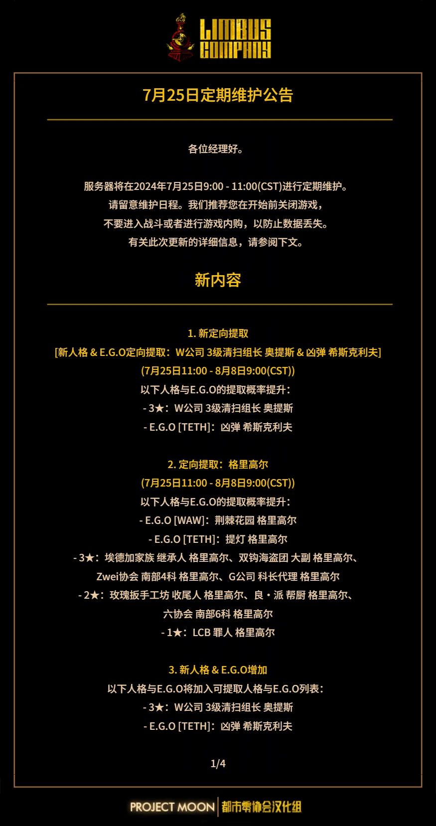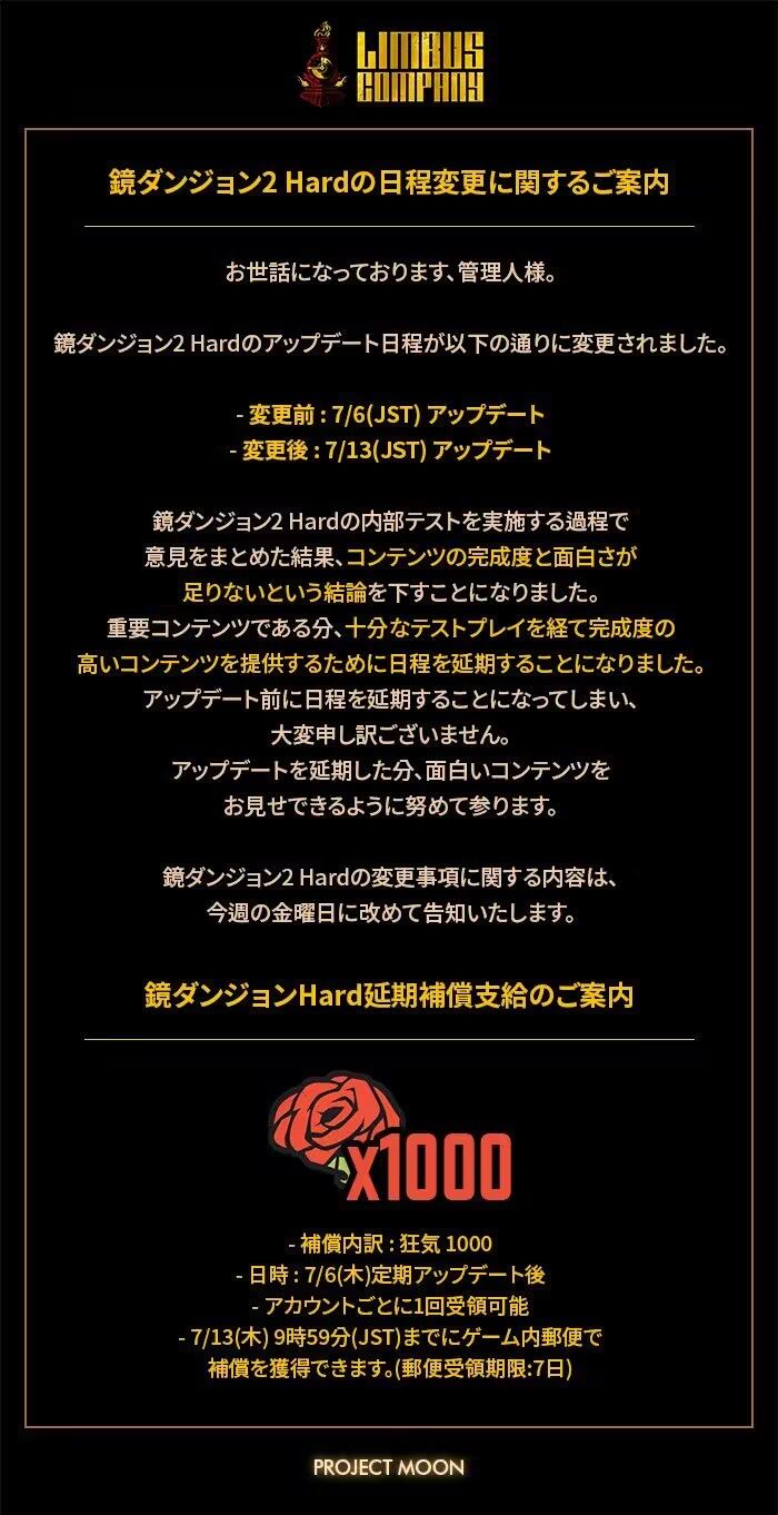 承蒙诸位经理关照。 [镜像迷宫2 困难模式]的更新日程将进行如下变更。 -原本:7/6(CST)更新 -变更:7/13(CST)更新 镜像迷宫困难模式延期补偿 - 补偿内容:1000狂气 - 补偿发放时间:7月6日(周四)预定更新结束后 - 每个账号可领取1次 - 可在7月13日(周四)08:59(CST)之前通过游戏内邮箱系统进行领取。 (邮件领取期限:7天) 在进行[镜
