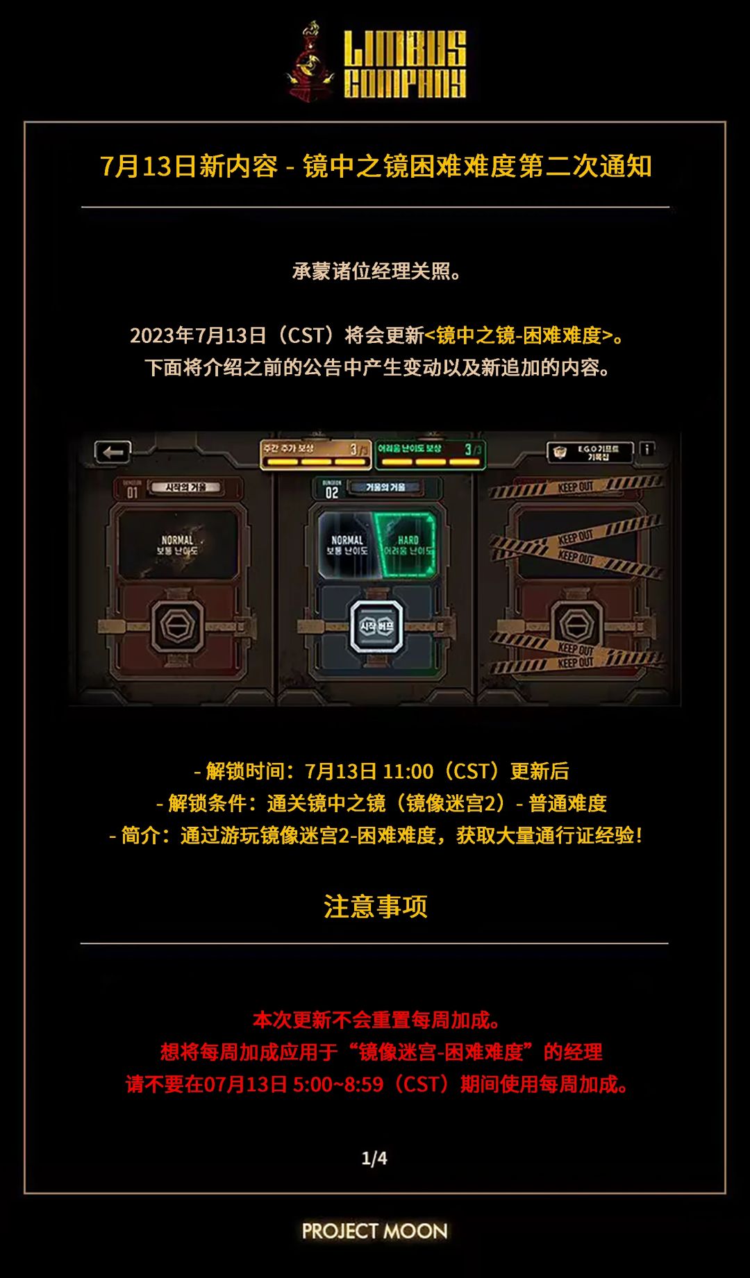承蒙诸位经理关照。 2023年7月13日(CST)将会更新<镜中之镜 - 困难难度>。 下面将介绍之前的公告中产生变动以及新追加的内容。 翻译:小白 玉佩