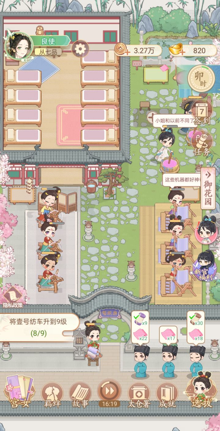 这个游戏有两个方向上的玩法,一个是主线的恋爱文字游戏类型,一个就是主角作为一个宫廷里面管制衣的女官,然后带领手下的秀女做一些纺织之类的类似于种田或者是经营任务玩法。