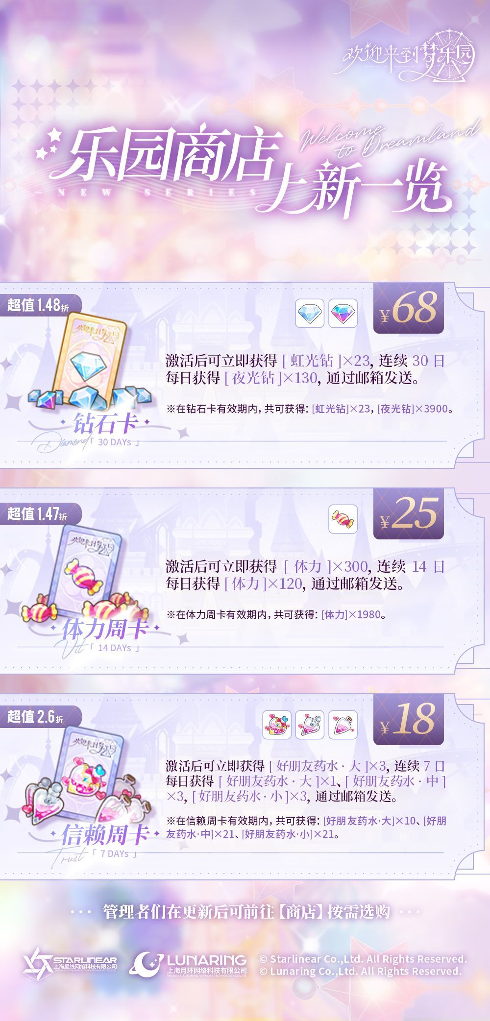 【乐园商店上新一览】 ⭐上新时间:9月27日维护后永久上架 ⭐上新内容: ◆钻石卡:售价¥68,激活后可立即获得[虹光钻]x23,连续30日每日获得[夜光钻]x130,通过邮箱发送。 在钻石卡有效期内,共可获得:[虹光钻]x23,[夜光钻]x3900。 ◆体力周卡:售价¥25,激活后可立即获得[体力]x300,连续14日每日获得[体力]x120,通过邮箱发送。 在体力周卡有效期内,共可获得:[体力