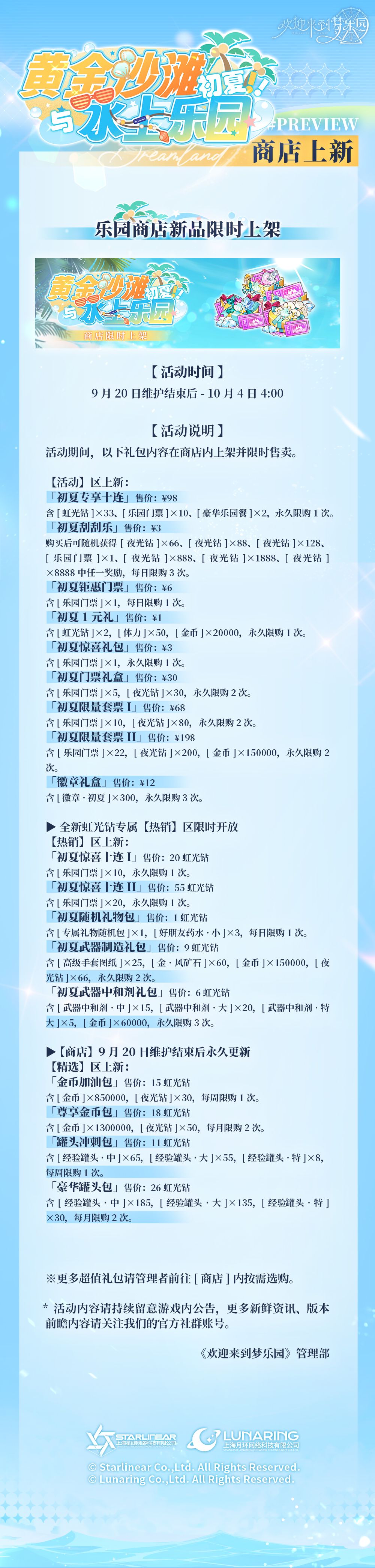 ✨限时主题活动丨「初夏!黄金沙滩与水上乐园」商店焕新 >>>新型礼包、全新超值性价比礼包、全新组合现已推出<<< -活动时间:9月20日维护结束后-10月4日4:00 -活动说明:活动期间,以下礼包内容在商店内上架并限时售卖。 ⭐【活动】区上新内容: 「初夏专享十连」售价:¥98,含[虹光钻]x33、[乐园门票]x10、[豪华乐园餐]x2,永久限购1次。 「初夏刮刮乐」售价:¥3,购买后可随机获得