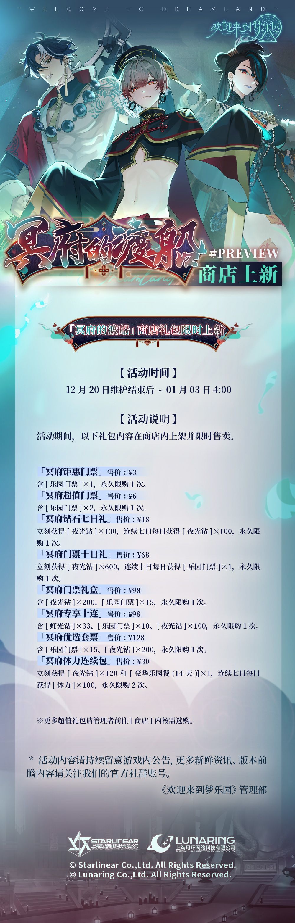 ✨全新常驻活动丨「冥府的渡船」商店礼包·限时上新 - 上架时间:12月20日维护结束后-2024年01月03日4:00 - 活动说明:活动期间,以下礼包内容在商店内上架并限时售卖。 部分礼包/系列礼包 内容如下: 「冥府钜惠门票」售价:¥3,含[乐园门票]x1,永久限购1次。 「冥府超值门票」售价:¥6,含[乐园门票]x2,永久限购1次。 「冥府钻石七日礼」售价:¥18,立刻获得[夜光钻]x13