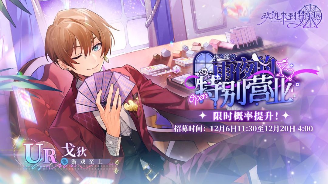 【限时活动招募更新】 本期新角色UR 戈狄[游戏至上]即将进行限时招募概率提升! ⭐招募时间 2023/12/06 11:30 - 2023/12/20 4:00 ⭐UP角色 UR 戈狄[游戏至上](水)(占UR出率的50%) ⭐招募说明 ※本招募卡池可以通过消耗[乐园门票]进行角色招募,每次招募会附赠1枚[幻梦之羽]。 ※此次限时概率提升期间,UP角色将会同步开放羽毛商店兑换,消耗[幻梦之羽]即