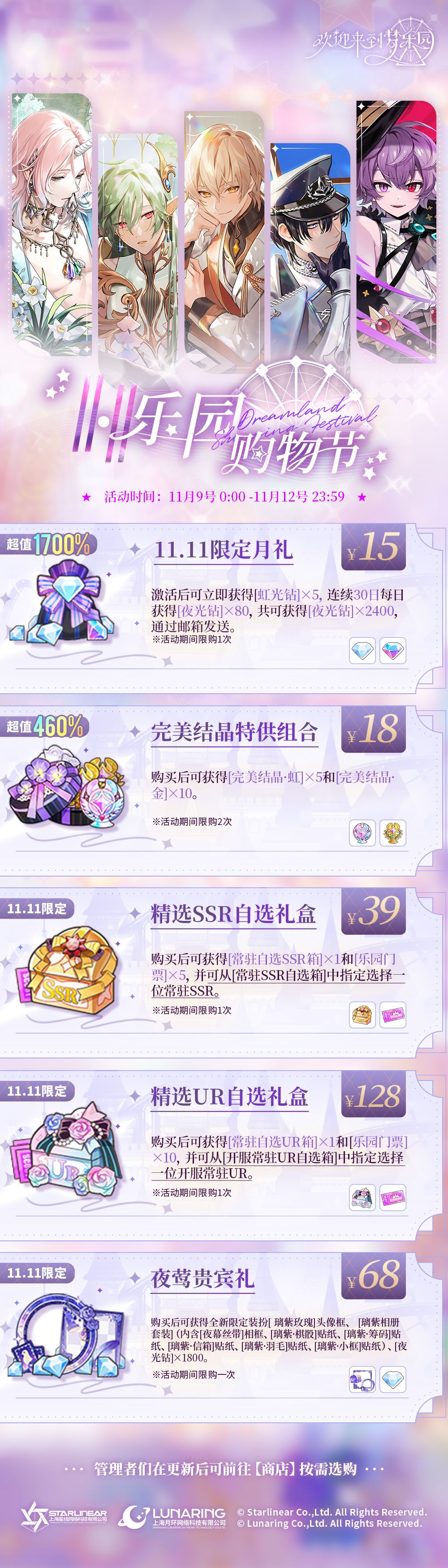 「11.11乐园购物节」预告 双11乐园购物狂欢—— 🎈超值组合,包括自选UR、自选SSR精选礼包,半价“月卡”,特惠“完美结晶”,限定装扮! 🎈限时贩售,仅限4天! 🎈特惠直购,低至0.5折! 走过路过不要错过!乐园购物节!好东西好价格哦! 【活动时间】 11月09日(四)00:00 - 11月12日(日)23:59 【限时上新内容】 ⭐11.11限定月礼——售价¥15 激活后可立即获得[虹光钻