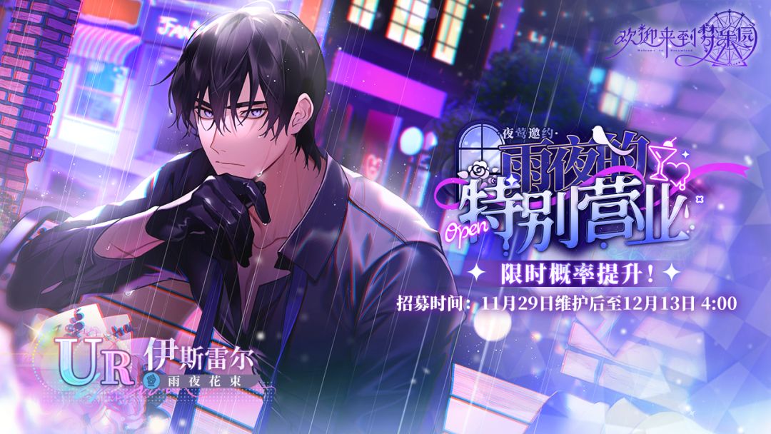 【限时活动招募更新】 本期新角色UR 伊斯雷尔[雨夜花束]即将进行限时招募概率提升! ⭐招募时间 2023/11/29 维护后 - 2023/12/13 4:00 ⭐UP角色 UR 伊斯雷尔[雨夜花束](水)(占UR出率的50%) ⭐招募说明 ※本招募卡池可以通过消耗[乐园门票]进行角色招募,每次招募会附赠1枚[幻梦之羽]。 ※此次限时概率提升期间,UP角色将会同步开放羽毛商店兑换,消耗[幻梦之羽