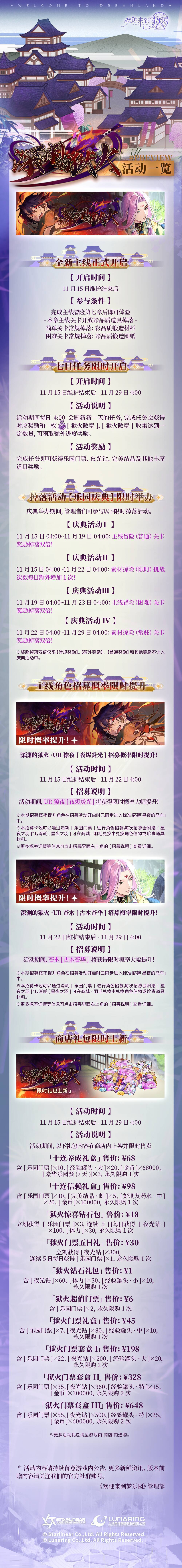 「深渊的狱火」主线更新维护公告 亲爱的管理者: 《欢迎来到梦乐园》计划将于11月15日上午11点00分进行停服更新维护,届时所有游戏服务器将无法登录,请管理者合理安排时间。本次更新给大家带来的不便,敬请谅解。 ⭐维护时间:2023/11/15 11:00 - 2023/11/15 13:00(预计2小时) ※本次维护时间不排除延迟开服的可能,请关注官方公告。 ⭐维护补偿 停服维护补偿:夜光钻×