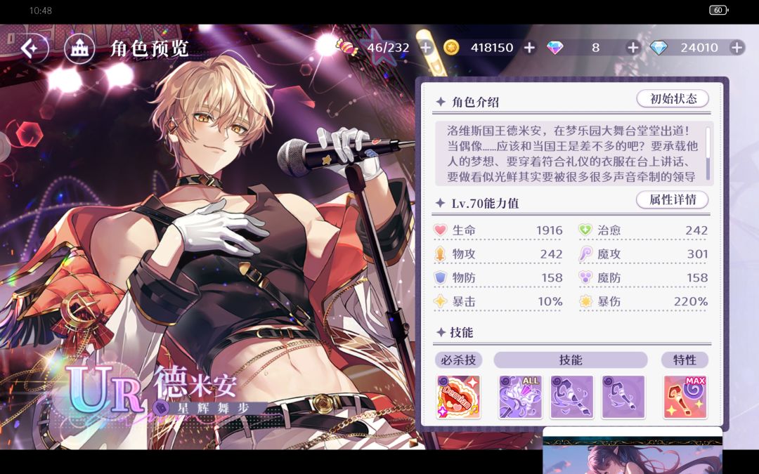 #欢迎来到梦乐园 虽然有人说丑,不过个人觉得这个德米安还是挺好看的有点男团那味儿 强度也很高,适合打单体boss 欢的饮料:冷萃桂花焙茶 森林幽兰露 喜欢的食物:鹅肝菌酱佐牛排 全派炖汤 1.你刚进来的时候好像气呼呼的:诶?被发现了吗? 2.偶像是造梦者......:能和德米安一起造梦很开心 3.今晚的舞台虽然很小,但是很紧张:当然可以啦 4.今天听了费尔蒙的新歌:很好啊 5.今天好像来晚一点:
