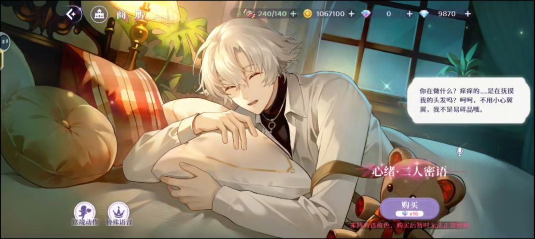 饮料🍹海盐柠檬气泡特饮、特制巨无霸奶茶、热带爆珠冰沙 食物🍽鹅肝菌菇酱佐牛排、蜂蜜薄荷软松饼、樱桃脆饼黑巧派、香烤蜂蜜苹果挞 对话 会不会很忙→很闲来找你玩/好忙好忙 海鲜和甜品有可能结合在一起吗→试试看 怀念海盐薄荷布丁→我们去塔吉玛 苦心钻研扑克牌→要和我来一把吗 什么事都不做也很愉快→我也是哦 对别人的看法→恩贝尔 享受独处时光→摸摸头 要说悄悄话吗→贴贴 写字的声音→在画你 去瓦兰度假→当