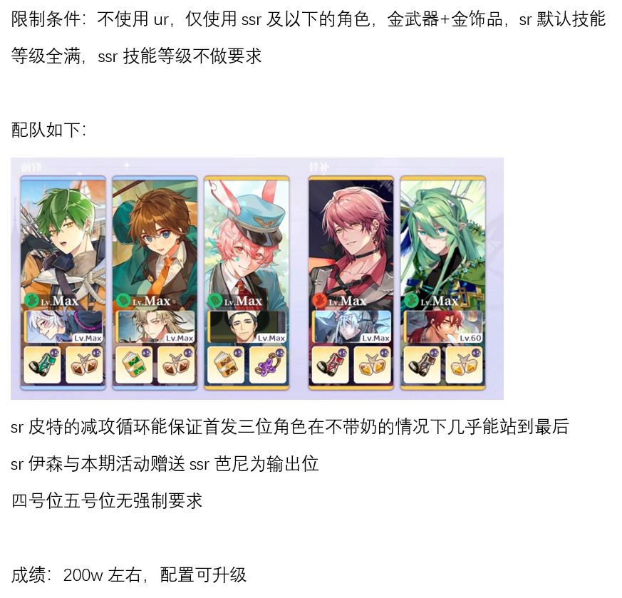 限制条件:不使用ur,仅使用ssr及以下的角色,金武器+金饰品,sr默认技能等级全满,活动赠送ssr默认技能全满,其余ssr技能等级不做要求 配队如下: 皮特+伊森+芭尼 sr皮特的减攻循环能保证首发三位角色在不带奶的情况下几乎能站到最后 sr伊森与本期活动赠送ssr芭尼为输出位 四号位五号位无强制要求 成绩:200w左右,配置可升级