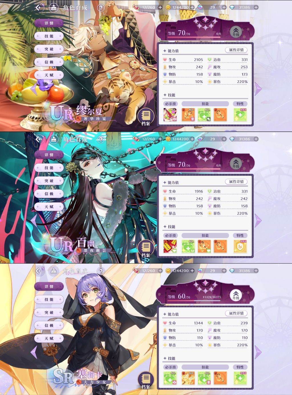 各个属性都有,只要上榜了都能养! ! !除了盾系! ! ![心动小镇_不可以] 萌新作为过渡期几个ur养到50、60级主线基本没问题,不需要太过纠结强度、养谁等。[心动小镇_疑问] 因为这个游戏只是纯XP以及收集观赏、养老游戏[心动小镇_害羞]后期你拥有的角色多了可以再纠结强度打叠叠乐、深渊、打塔等。[心动小镇_可以] PS:叠叠乐不知道上谁就看排行榜,大佬们的阵容都公开的,照着配就行[心动小镇_大笑]