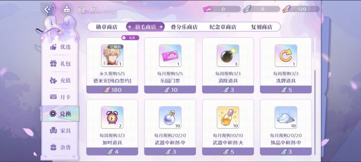 有常驻角色开up池的话 能在商店用180蓝羽毛换纪念章可以先攒着 等能换角色的时候再换成蓝羽毛商店其实没什么值得换的东西 我一般换衣服或者彩色完美结晶 票子太贵了 性价比有点低 可以等抽卡弹尽粮绝的时候再换