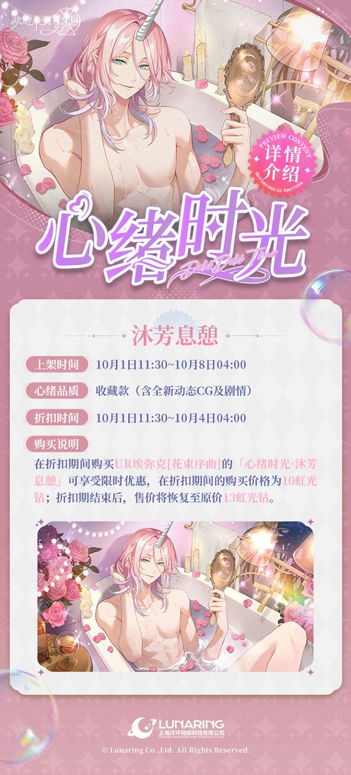 ✨「心绪时光·沐芳息憩」限时折扣上架!〓折扣时间〓10月1日11:30~10月4日04:00〓心绪说明〓埃弥克[花束序曲]心绪时光10月1日11:30~10月8日04:00限时上架!- 类型:【收藏款】- 售价:在折扣期间购买「心绪时光·沐芳息憩」可享受限时优惠,在折扣期间的购买价格为10虹光钻,折扣期结束后,售价将恢复至原价13虹光钻。- 内容:解锁「心绪时光·沐芳息憩」- 查看
