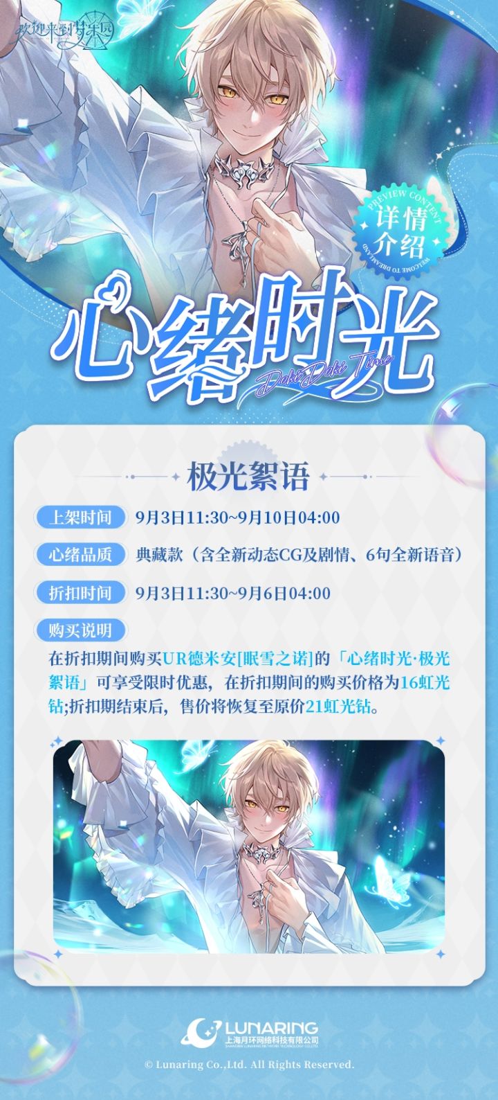 ✨「心绪时光·极光絮语」限时折扣上架“可以抱住你吗?除了眼睛,我也想用身体记住这一刻……”〓折扣时间〓9月3日11:30~9月6日04:00〓心绪说明〓德米安[眠雪之诺]心绪时光9月3日11:30~9月10日04:00限时上架!- 类型:【典藏款】- 售价:在折扣期间购买「心绪时光·极光絮语」可享受限时优惠,在折扣期间的购买价格为16虹光钻,折扣期结束后,售价将恢复至原价21虹光钻。