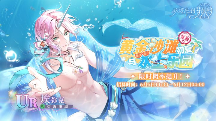 【初夏!黄金沙滩与水上乐园·埃弥克 [碧海珊瑚]·招募预告】复刻活动「初夏!黄金沙滩与水上乐园」角色 UR埃弥克 [碧海珊瑚] 即将进行限时招募概率提升!⭐招募时间2024/6/5 11:30 - 2024/6/12 04:00⭐UP角色UR 埃弥克 [碧海珊瑚](风)(占UR出率的50%)⭐招募说明※本招募卡池可以通过消耗[乐园门票]进行角色招募,每次招募会附赠1枚[幻梦之羽]。※