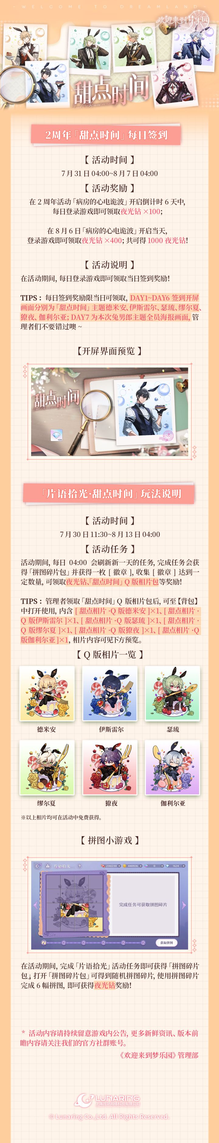 ✨全新活动「片语拾光·甜点时间」7月30日开启!“危情蜜诱,恣意甜心”⭐「2周年·甜点时间」倒计时每日签到开启⭐全新活动「片语拾光·甜点时间」开启:完成活动任务、参与拼图小游戏,即可领取角色Q版相片、夜光钻等奖励!点击下方长图,即可查看活动详情一览↓↓↓